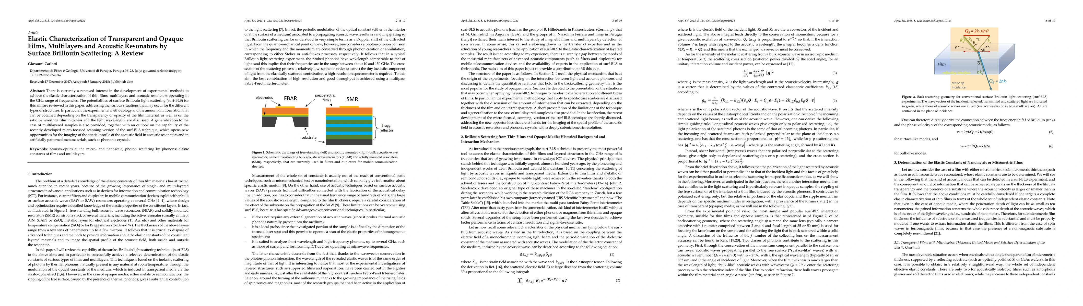 There is currently a renewed interest in the development of experimental methods to achieve the elastic characterization of thin films, multilayers and acoustic resonators operating in the GHz range of frequencies. The potentialities of surface Brillouin light scattering (surf-BLS) for this aim are reviewed in this paper, addressing the various situations that may occur for the different types of structures. In particular, the experimental methodology and the amount of information that can be obtained depending on the transparency or opacity of the film material, as well as on the ratio between the film thickness and the light wavelength, are discussed. A generalization to the case of multilayered samples is also provided, together with an outlook on the capability of the recently developed micro-focused scanning version of the surf-BLS technique, which opens new opportunities for the imaging of the spatial profile of the acoustic field in acoustic resonators and in artificially patterned metamaterials, such as phononic crystals.
