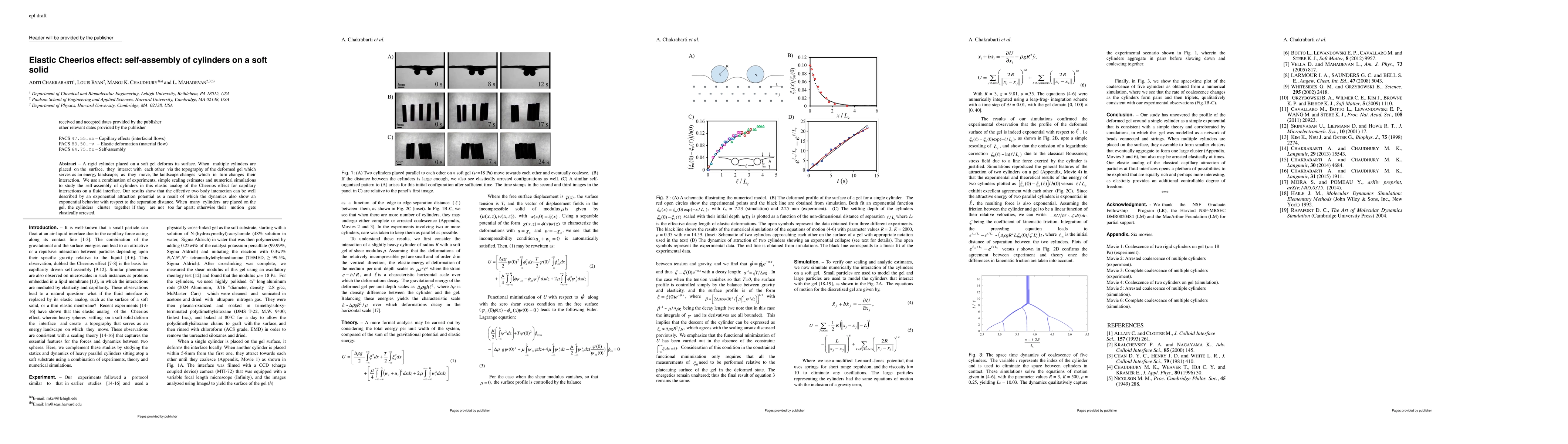 This paper investigates the self-assembly of rigid cylinders on a soft gel, demonstrating an elastic analog of the Cheerios effect. The study reveals that cylinders cluster together due to an exponential attraction potential, leading to exponential dynamics and elastic arrest when separation is too great.