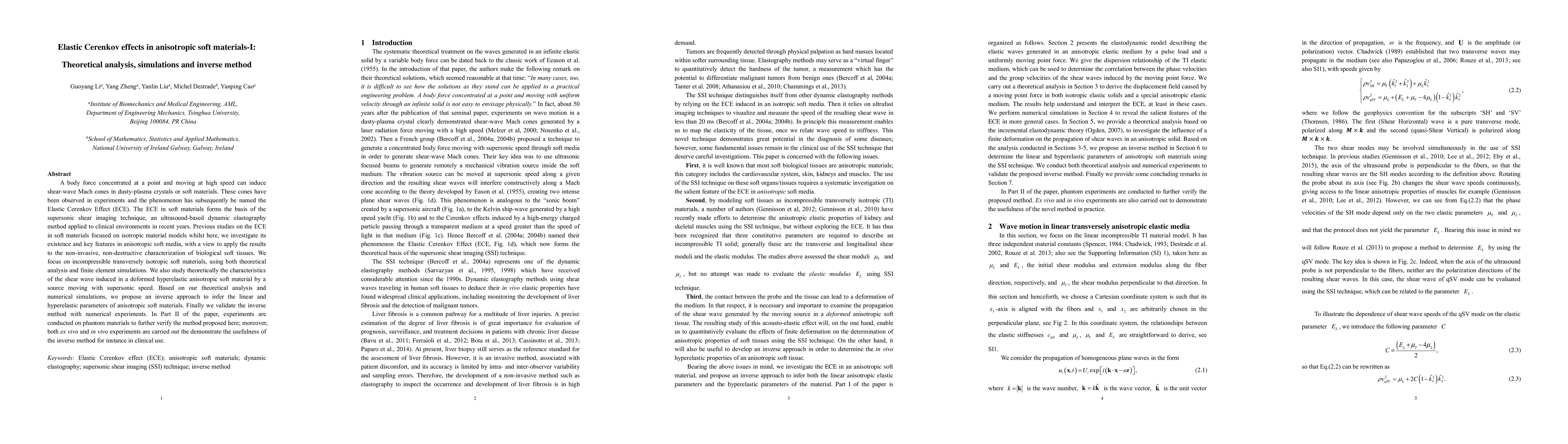 This paper investigates the elastic Cherenkov effect (ECE) in transversely isotropic soft materials using theoretical analysis, simulations, and an inverse method to characterize anisotropic and hyperelastic properties. It proposes an inverse approach for non-invasive tissue characterization and examines the properties of the solutions to the inverse problem.