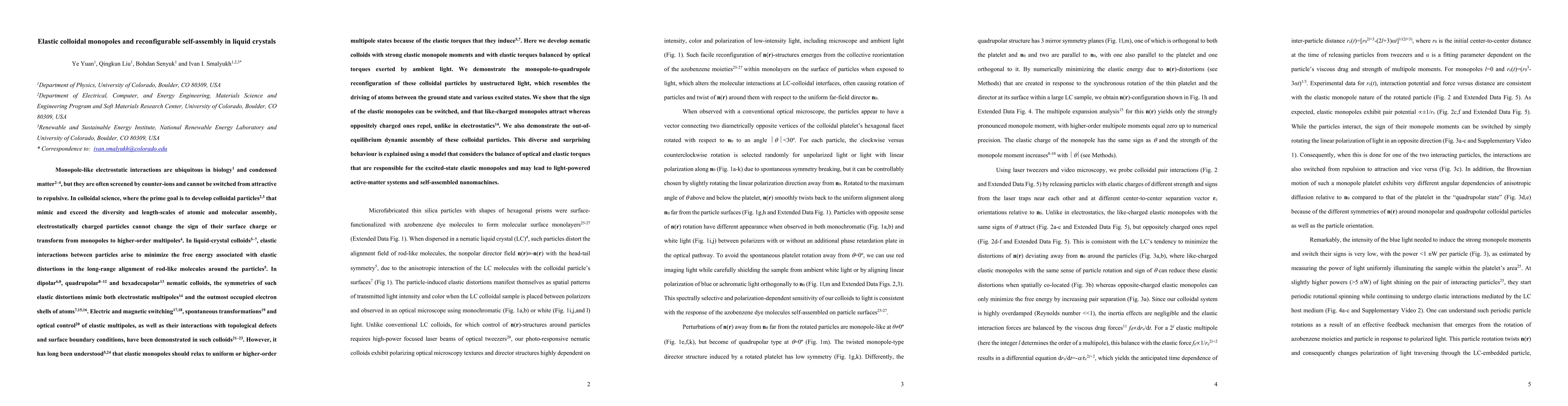 This paper develops nematic colloidal particles with strong elastic monopole moments that can reconfigure from monopoles to quadrupoles using unstructured light. Unlike electrostatic monopoles, these elastic monopoles can switch signs and exhibit attraction or repulsion based on their charge state, enabling dynamic, out-of-equilibrium self-assembly.