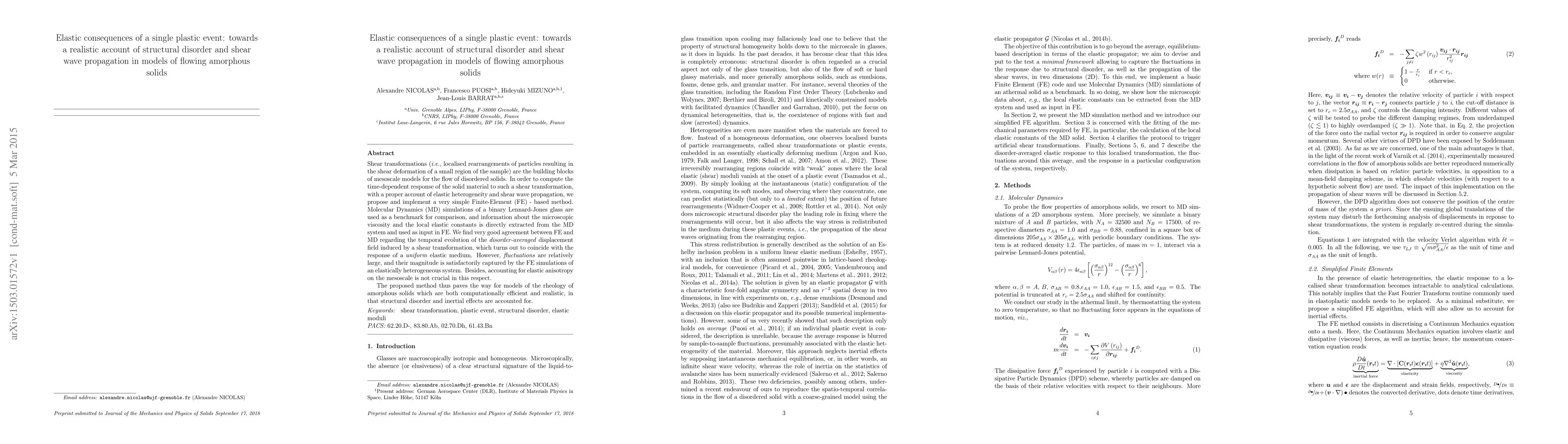 Shear transformations (i.e., localised rearrangements of particles resulting in the shear deformation of a small region of the sample) are the building blocks of mesoscale models for the flow of disordered solids. In order to compute the time-dependent response of the solid material to such a shear transformation, with a proper account of elastic heterogeneity and shear wave propagation, we propose and implement a very simple Finite-Element (FE) -based method. Molecular Dynamics (MD) simulations of a binary Lennard-Jones glass are used as a benchmark for comparison, and information about the microscopic viscosity and the local elastic constants is directly extracted from the MD system and used as input in FE. We find very good agreement between FE and MD regarding the temporal evolution of the disorder-averaged displacement field induced by a shear transformation, which turns out to coincide with the response of a uniform elastic medium. However, fluctuations are relatively large, and their magnitude is satisfactorily captured by the FE simulations of an elastically heterogeneous system. Besides, accounting for elastic anisotropy on the mesoscale is not crucial in this respect. The proposed method thus paves the way for models of the rheology of amorphous solids which are both computationally efficient and realistic, in that structural disorder and inertial effects are accounted for.