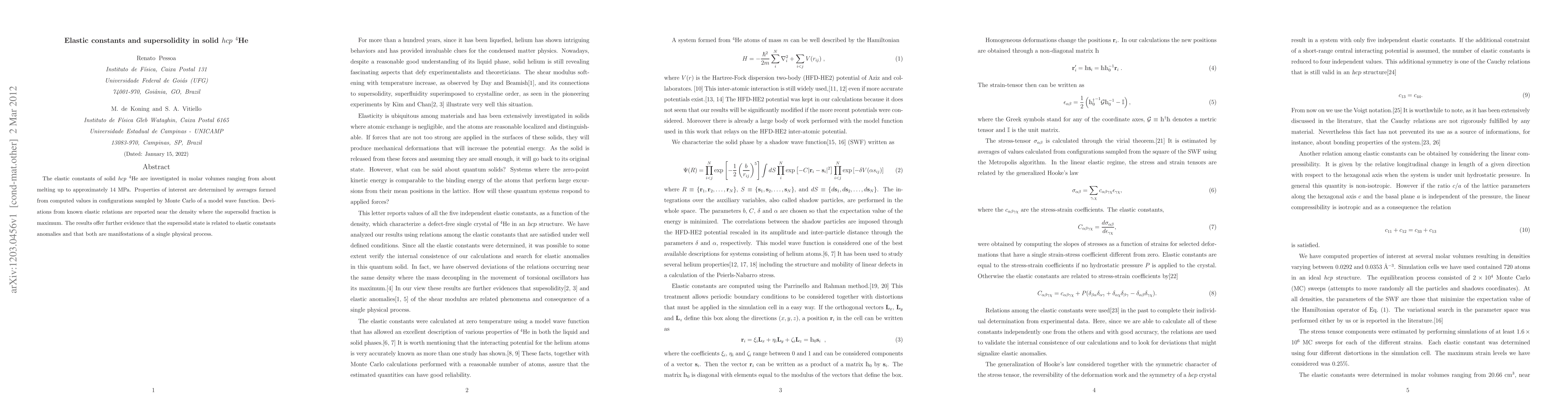 This paper investigates the elastic constants of solid hcp \textit{^4He} and finds anomalies in these constants near the density where the supersolid fraction peaks, providing evidence that supersolidity and elastic constant deviations are manifestations of a single physical process.