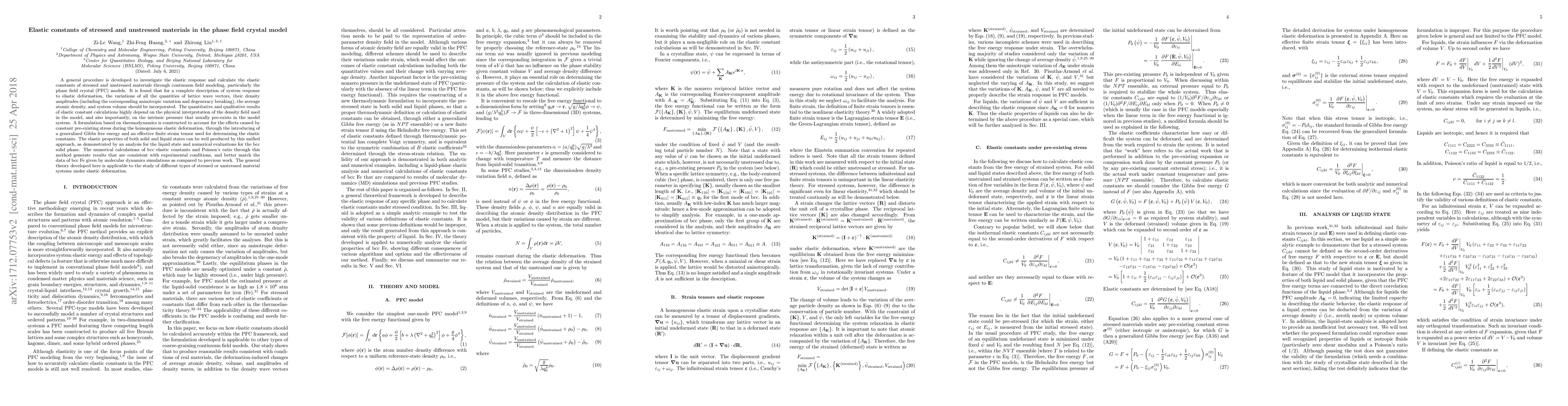 The research presents a general procedure to investigate the elastic response and calculate the elastic constants of stressed and unstressed materials using continuum field modeling, specifically the phase field crystal (PFC) models. It incorporates variations of lattice wave vectors, their density amplitudes, average atomic density, and system volume for a complete description of system response to elastic deformation.