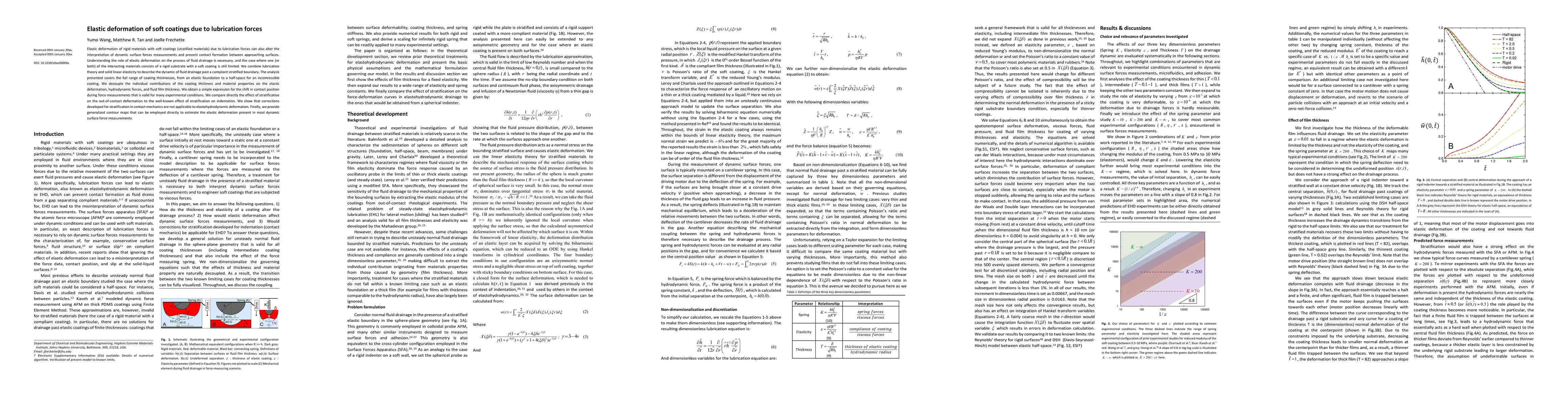 This research combines lubrication theory and solid linear elasticity to analyze the dynamic fluid drainage and elastic deformation in stratified materials under lubrication forces. It provides generalized maps to estimate elastic deformation during surface force measurements, highlighting differences between out-of-contact and contact mechanics deformation.