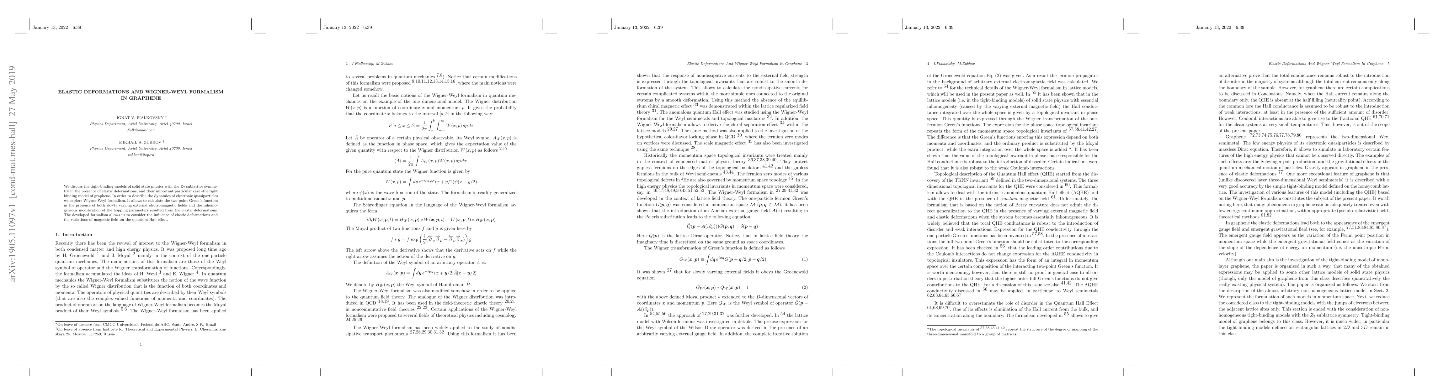 We discuss the tight-binding models of solid state physics with the $Z_2$ sublattice symmetry in the presence of elastic deformations, and their important particular case -the tight binding model of graphene. In order to describe the dynamics of electronic quasiparticles we explore Wigner-Weyl formalism. It allows to calculate the two-point Green's function in the presence of both slowly varying external electromagnetic fields and the inhomogeneous modification of the hopping parameters resulted from the elastic deformations. The developed formalism allows us to consider the influence of elastic deformations and the variations of magnetic field on the quantum Hall effect.