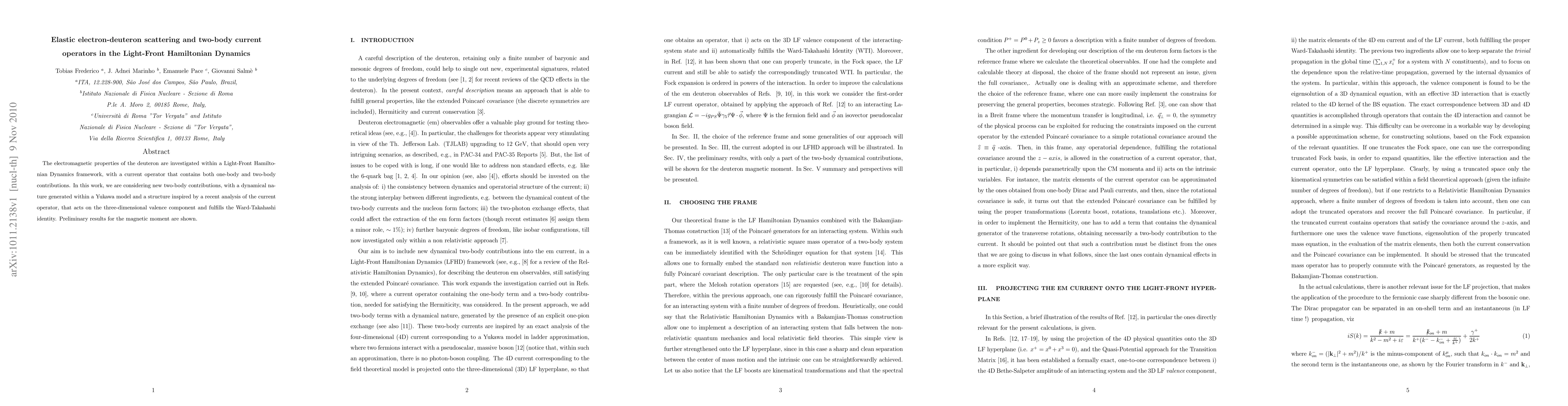 This paper investigates the electromagnetic properties of the deuteron using a Light-Front Hamiltonian Dynamics framework, incorporating both one-body and innovative two-body current operators. Preliminary results for the deuteron's magnetic moment are presented, highlighting the new two-body contributions derived from a Yukawa model.
