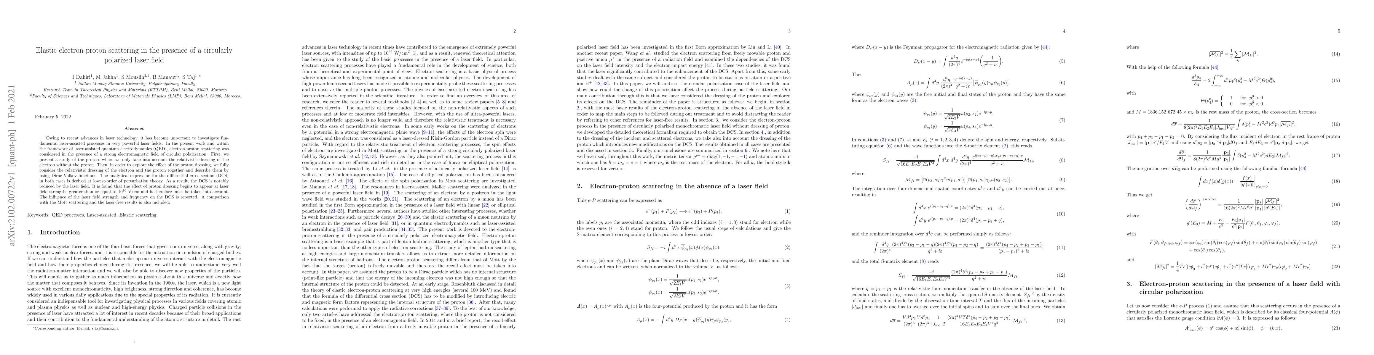 The study investigates elastic electron-proton scattering using laser-assisted quantum electrodynamics (QED) in a strong circularly polarized electromagnetic field, considering relativistic dressing of electrons and protons with Dirac-Volkov functions.