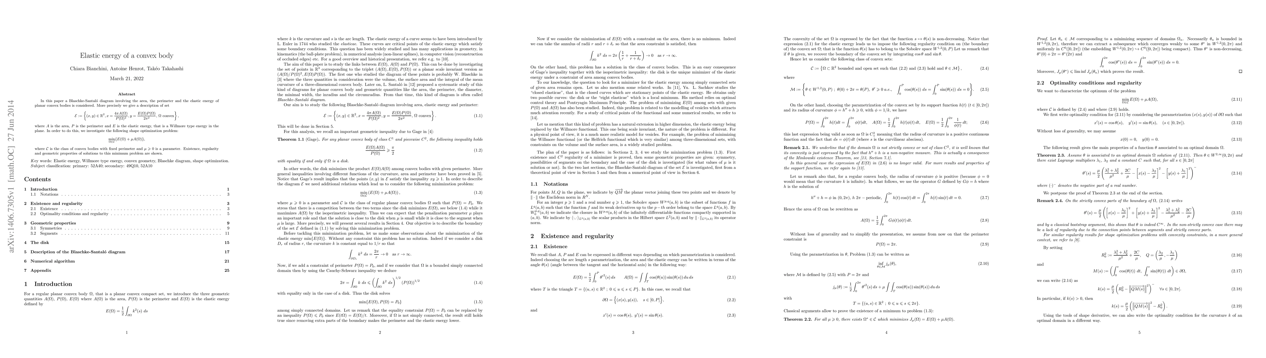In this paper a Blaschke-Santal\'o diagram involving the area, the perimeter and the elastic energy of planar convex bodies is considered. More precisely we give a description of set $$\mathcal{E}:=\left\{(x,y)\in \R^2, x=\frac{4\pi A(\Omega)}{P(\Omega)^2},y=\frac{E(\Omega)P(\Omega)}{2\pi^2},\,\Omega\mbox{convex} \right\},$$ where $A$ is the area, $P$ is the perimeter and $E$ is the elastic energy, that is a Willmore type energy in the plane. In order to do this, we investigate the following shape optimization problem: $$\min_{\Omega\in\mathcal{C}}\{E(\Omega)+\mu A(\Omega)\},$$ where $\mathcal{C}$ is the class of convex bodies with fixed perimeter and $\mu\ge 0$ is a parameter. Existence, regularity and geometric properties of solutions to this minimum problem are shown.