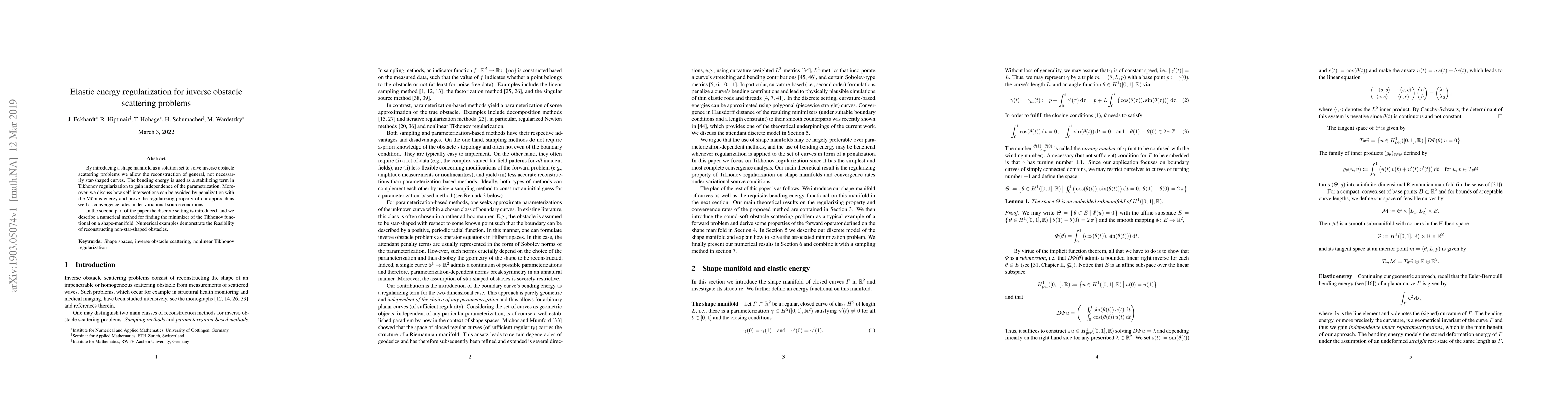 By introducing a shape manifold as a solution set to solve inverse obstacle scattering problems we allow the reconstruction of general, not necessarily star-shaped curves. The bending energy is used as a stabilizing term in Tikhonov regularization to gain independence of the parametrization. Moreover, we discuss how self-intersections can be avoided by penalization with the M\"obius energy and prove the regularizing property of our approach as well as convergence rates under variational source conditions. In the second part of the paper the discrete setting is introduced, and we describe a numerical method for finding the minimizer of the Tikhonov functional on a shape-manifold. Numerical examples demonstrate the feasibility of reconstructing non-star-shaped obstacles.