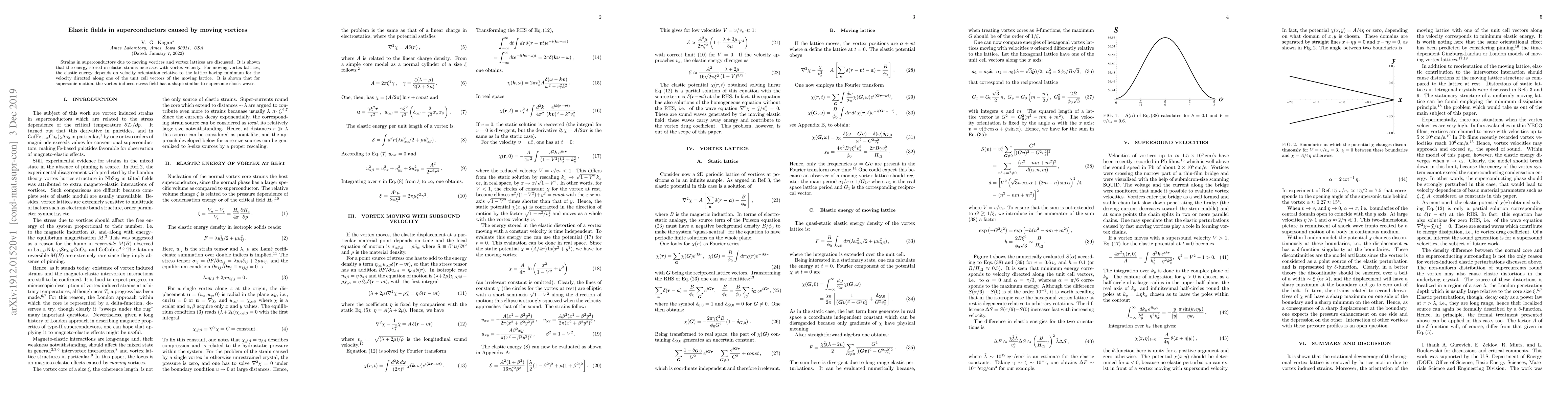 The paper presents a detailed mathematical analysis of elastic fields in superconductors due to moving vortices, providing insights into energy storage and distribution in such systems.