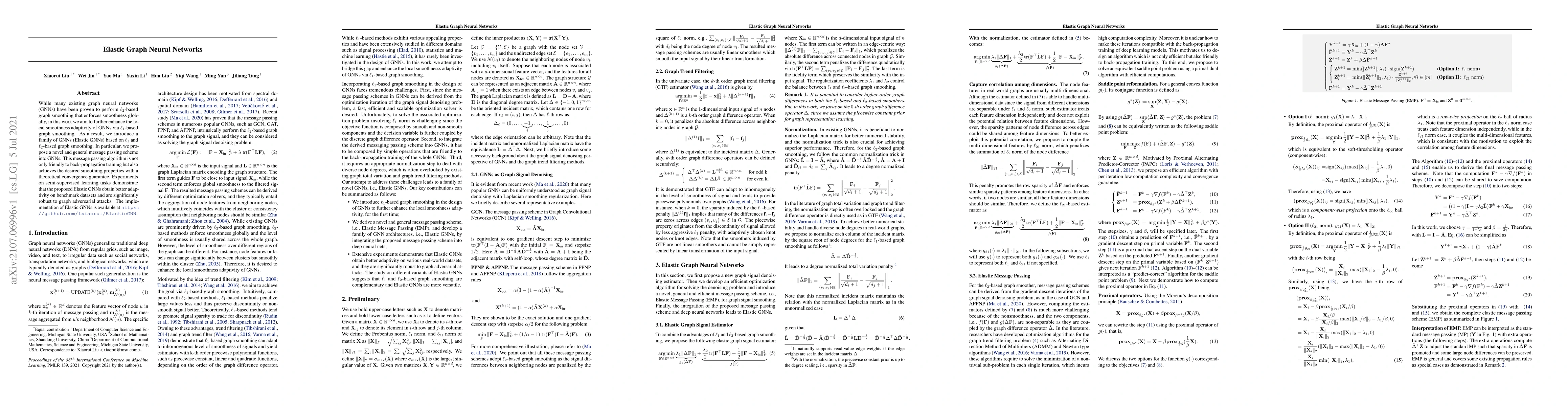 While many existing graph neural networks (GNNs) have been proven to perform $\ell_2$-based graph smoothing that enforces smoothness globally, in this work we aim to further enhance the local smoothness adaptivity of GNNs via $\ell_1$-based graph smoothing. As a result, we introduce a family of GNNs (Elastic GNNs) based on $\ell_1$ and $\ell_2$-based graph smoothing. In particular, we propose a novel and general message passing scheme into GNNs. This message passing algorithm is not only friendly to back-propagation training but also achieves the desired smoothing properties with a theoretical convergence guarantee. Experiments on semi-supervised learning tasks demonstrate that the proposed Elastic GNNs obtain better adaptivity on benchmark datasets and are significantly robust to graph adversarial attacks. The implementation of Elastic GNNs is available at \url{https://github.com/lxiaorui/ElasticGNN}.