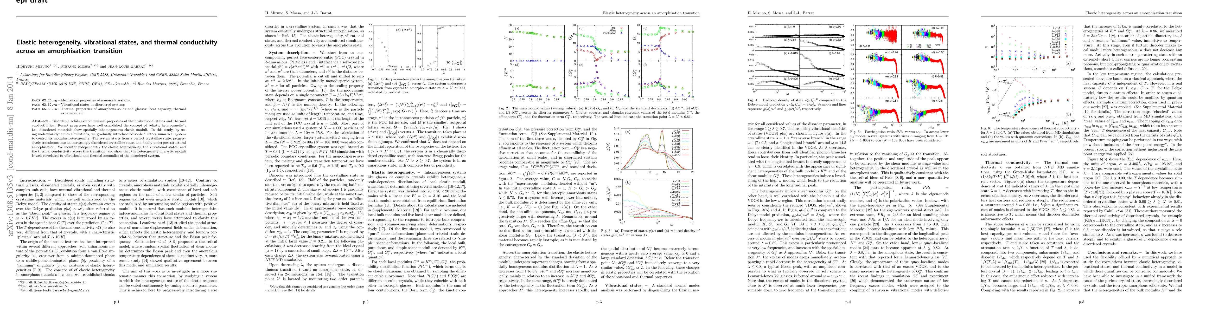 Disordered solids exhibit unusual properties of their vibrational states and thermal conductivities. Recent progresses have well established the concept of "elastic heterogeneity", i.e., disordered materials show spatially inhomogeneous elastic moduli. In this study, by using molecular-dynamics simulations, we gradually introduce "disorder" into a numerical system to control its modulus heterogeneity. The system starts from a perfect crystalline state, progressively transforms into an increasingly disordered crystalline state, and finally undergoes structural amorphisation. We monitor independently the elastic heterogeneity, the vibrational states, and the thermal conductivity across this transition, and show that the heterogeneity in elastic moduli is well correlated to vibrational and thermal anomalies of the disordered system.