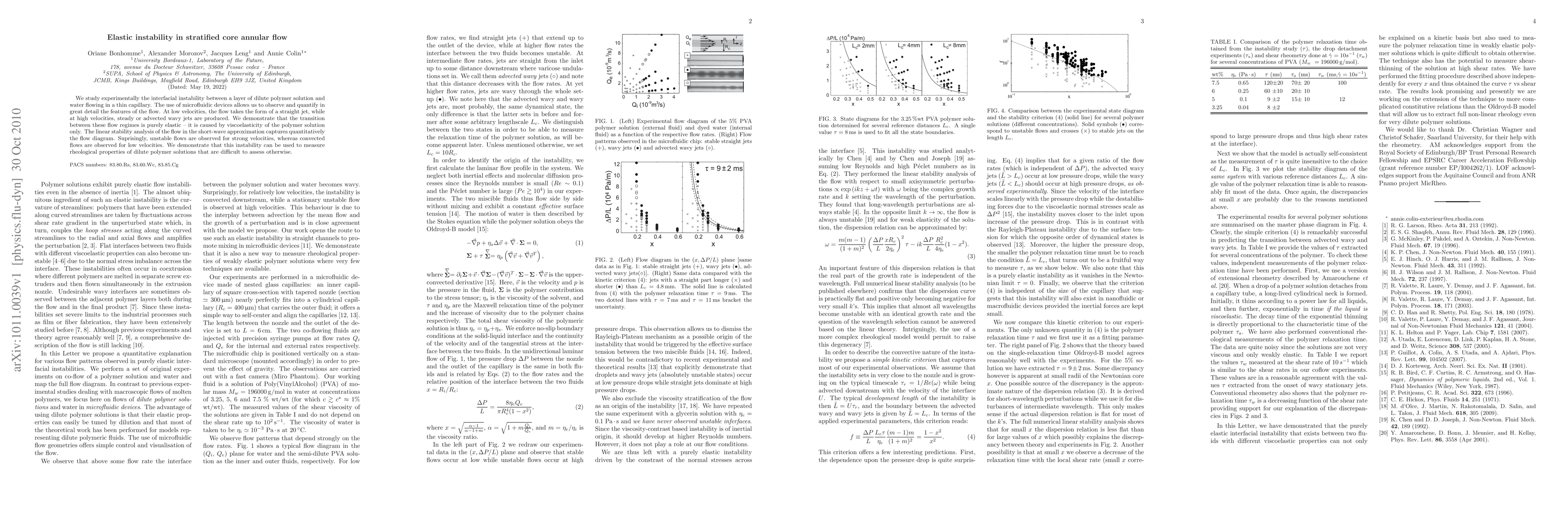 We study experimentally the interfacial instability between a layer of dilute polymer solution and water flowing in a thin capillary. The use of microfluidic devices allows us to observe and quantify in great detail the features of the flow. At low velocities, the flow takes the form of a straight jet, while at high velocities, steady or advected wavy jets are produced. We demonstrate that the transition between these flow regimes is purely elastic -- it is caused by viscoelasticity of the polymer solution only. The linear stability analysis of the flow in the short-wave approximation captures quantitatively the flow diagram. Surprisingly, unstable flows are observed for strong velocities, whereas convected flows are observed for low velocities. We demonstrate that this instability can be used to measure rheological properties of dilute polymer solutions that are difficult to assess otherwise.
