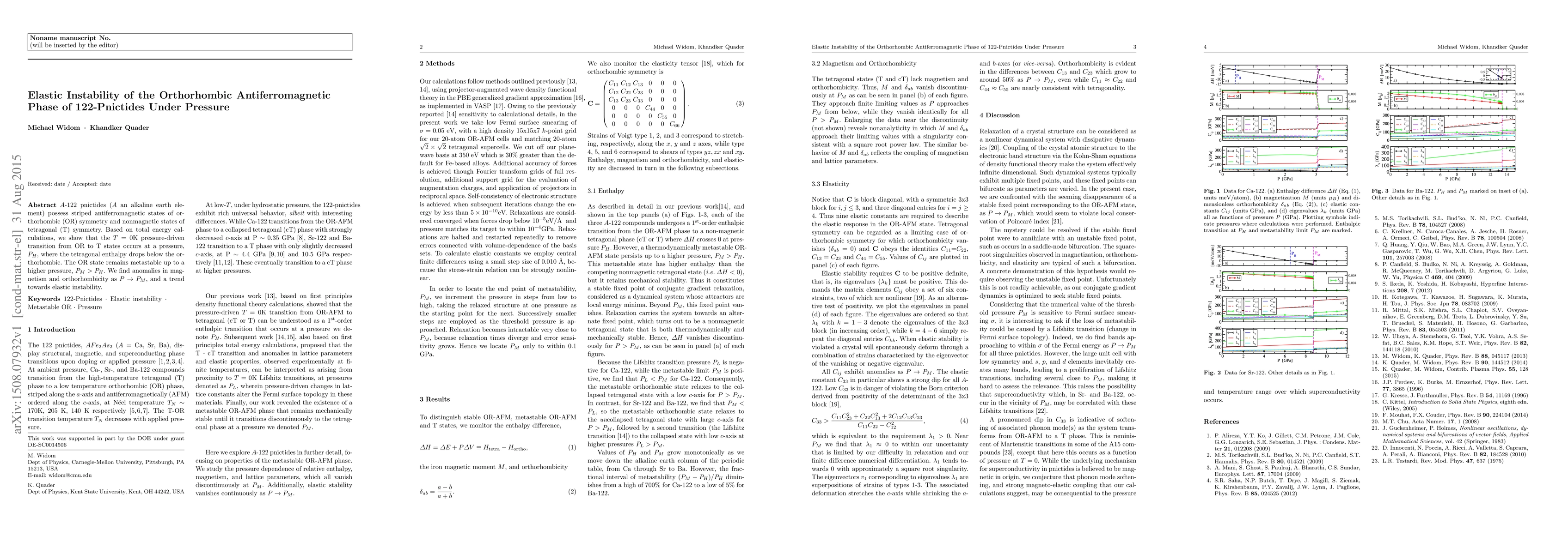 A-122 pnictides (A an alkaline earth element) possess striped antiferromagnetic states of orthorhombic (OR) symmetry and nonmagnetic states of tetragonal (T) symmetry. Based on total energy calculations, we show that the T = 0K pressure-driven transition from OR to T states occurs at a pressure, $P_H$, where the tetragonal enthalpy drops below the orthorhombic. The OR state remains metastable up to a higher pressure, $P_M$ > $P_H$. We find anomalies in magnetism and orthorhombicity as $P \rightarrow P_M$, and a trend towards elastic instability.