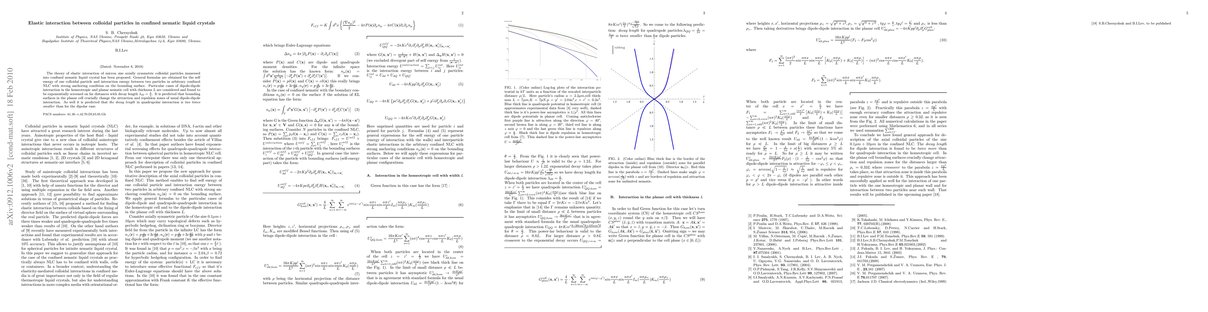 The theory of elastic interaction of micron size axially symmetric colloidal particles immersed into confined nematic liquid crystal has been proposed. General formulas are obtained for the self energy of one colloidal particle and interaction energy between two particles in arbitrary confined NLC with strong anchoring condition on the bounding surface. Particular cases of dipole-dipole interaction in the homeotropic and planar nematic cell with thickness $L$ are considered and found to be exponentially screened on far distances with decay length $\lambda_{dd}=\frac{L}{\pi}$. It is predicted that bounding surfaces in the planar cell crucially change the attraction and repulsion zones of usual dipole-dipole interaction. As well it is predicted that \textit{the decay length} in quadrupolar interaction is \textit{two times smaller} than for the dipolar case.