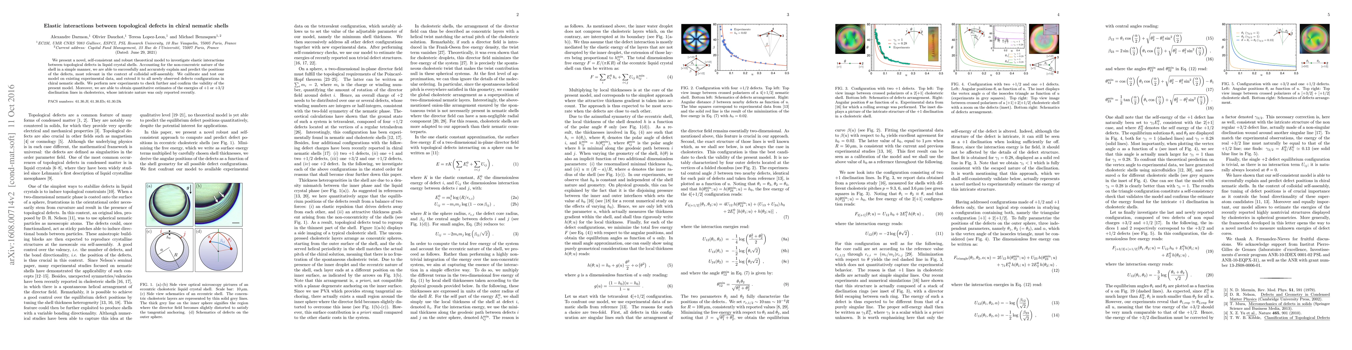 This paper develops a theoretical model to study elastic interactions between topological defects in chiral nematic liquid crystal shells, successfully predicting defect positions and validating the model through experiments and existing data. The model also provides quantitative estimates for the energies of specific disclination lines in cholesterics.