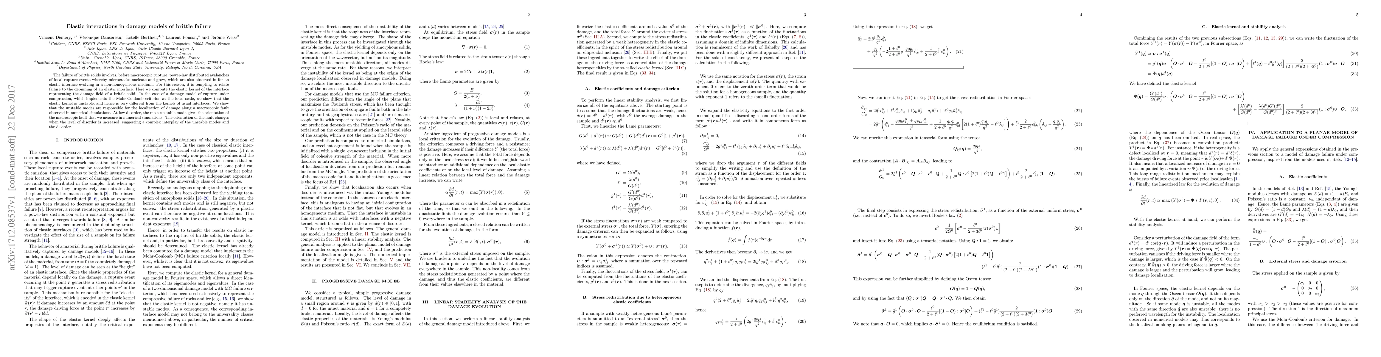 This paper investigates the elastic interactions in damage models of brittle failure, demonstrating that the elastic kernel of the damage field is unstable, leading to the localization of damage along macroscopic faults. The study shows that the orientation of these faults is influenced by the interplay between the unstable elastic modes and the level of disorder in the system.