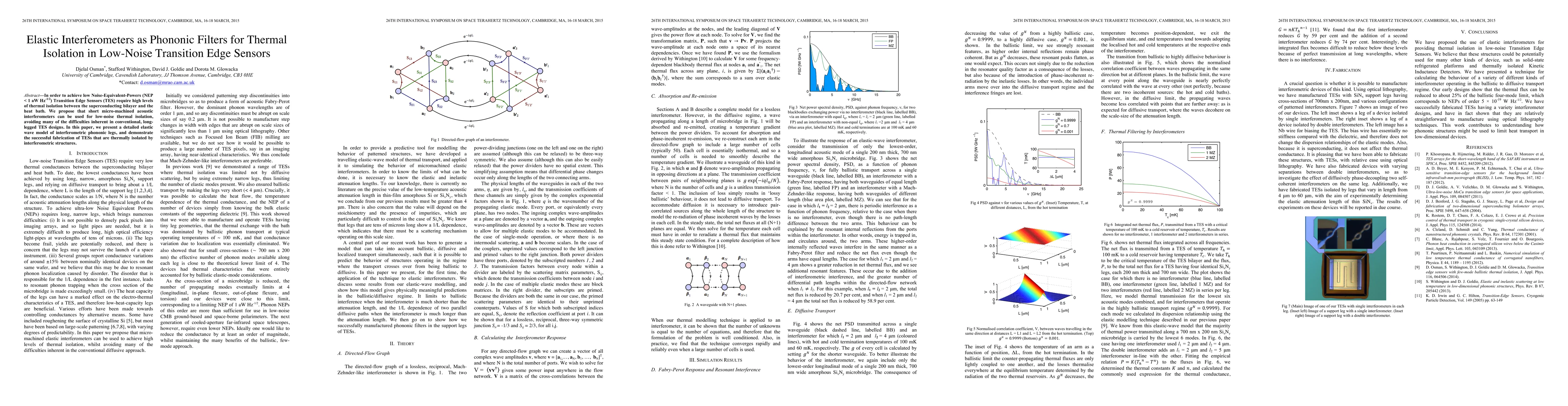 This paper proposes using short micro-machined acoustic interferometers as phononic filters to achieve high thermal isolation in low-noise Transition Edge Sensors (TES). The authors present an elastic wave model and demonstrate the successful fabrication of TESs with significantly reduced noise levels.