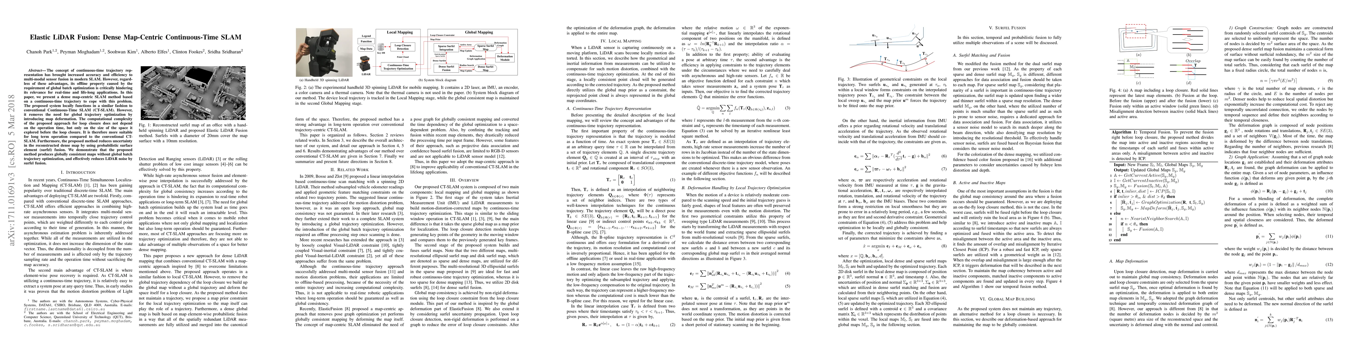 The concept of continuous-time trajectory representation has brought increased accuracy and efficiency to multi-modal sensor fusion in modern SLAM. However, regardless of these advantages, its offline property caused by the requirement of global batch optimization is critically hindering its relevance for real-time and life-long applications. In this paper, we present a dense map-centric SLAM method based on a continuous-time trajectory to cope with this problem. The proposed system locally functions in a similar fashion to conventional Continuous-Time SLAM (CT-SLAM). However, it removes the need for global trajectory optimization by introducing map deformation. The computational complexity of the proposed approach for loop closure does not depend on the operation time, but only on the size of the space it explored before the loop closure. It is therefore more suitable for long term operation compared to the conventional CT-SLAM. Furthermore, the proposed method reduces uncertainty in the reconstructed dense map by using probabilistic surface element (surfel) fusion. We demonstrate that the proposed method produces globally consistent maps without global batch trajectory optimization, and effectively reduces LiDAR noise by surfel fusion.