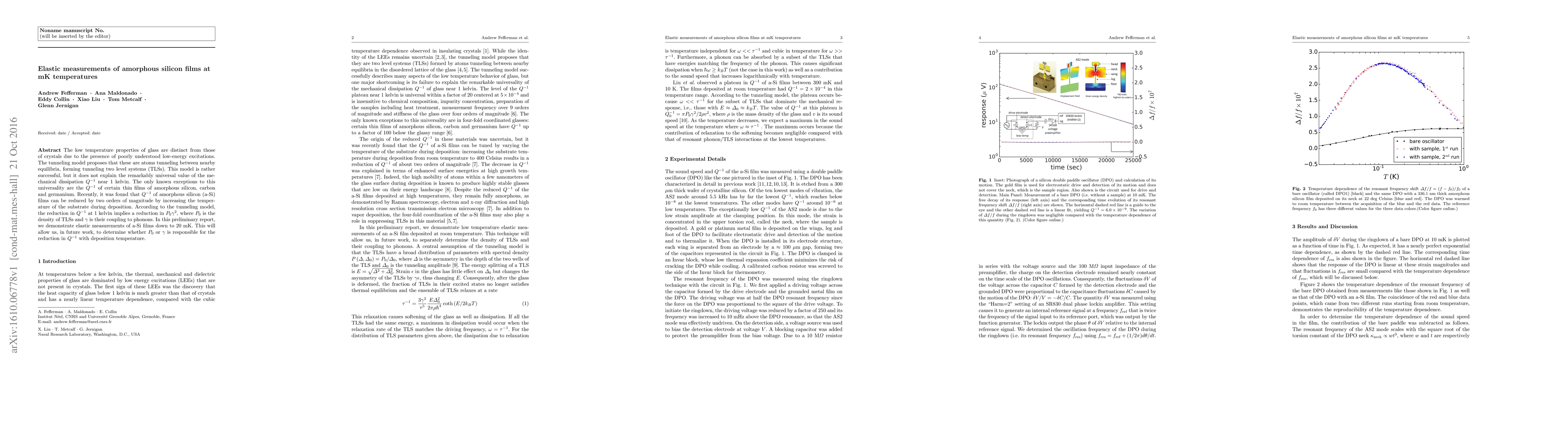 The low temperature properties of glass are distinct from those of crystals due to the presence of poorly understood low-energy excitations. The tunneling model proposes that these are atoms tunneling between nearby equilibria, forming tunneling two level systems (TLSs). This model is rather successful, but it does not explain the remarkably universal value of the mechanical dissipation $Q^{-1}$ near 1 kelvin. The only known exceptions to this universality are the $Q^{-1}$ of certain thin films of amorphous silicon, carbon and germanium. Recently, it was found that $Q^{-1}$ of amorphous silicon (a-Si) films can be reduced by two orders of magnitude by increasing the temperature of the substrate during deposition. According to the tunneling model, the reduction in $Q^{-1}$ at 1 kelvin implies a reduction in $P_{0}\gamma ^{2}$, where $P_{0}$ is the density of TLSs and $\gamma $ is their coupling to phonons. In this preliminary report, we demonstrate elastic measurements of a-Si films down to 20 mK. This will allow us, in future work, to determine whether $P_{0}$ or $\gamma $ is responsible for the reduction in $Q^{-1}$ with deposition temperature.