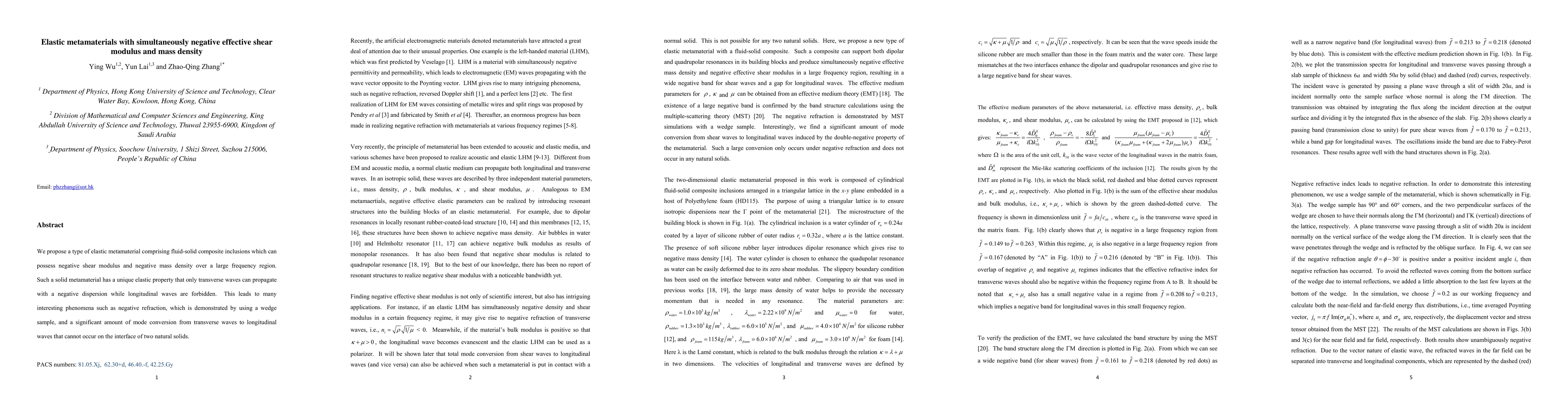 This paper introduces elastic metamaterials with fluid-solid composite inclusions that exhibit negative shear modulus and mass density, enabling unique wave propagation properties, including negative refraction and significant mode conversion.