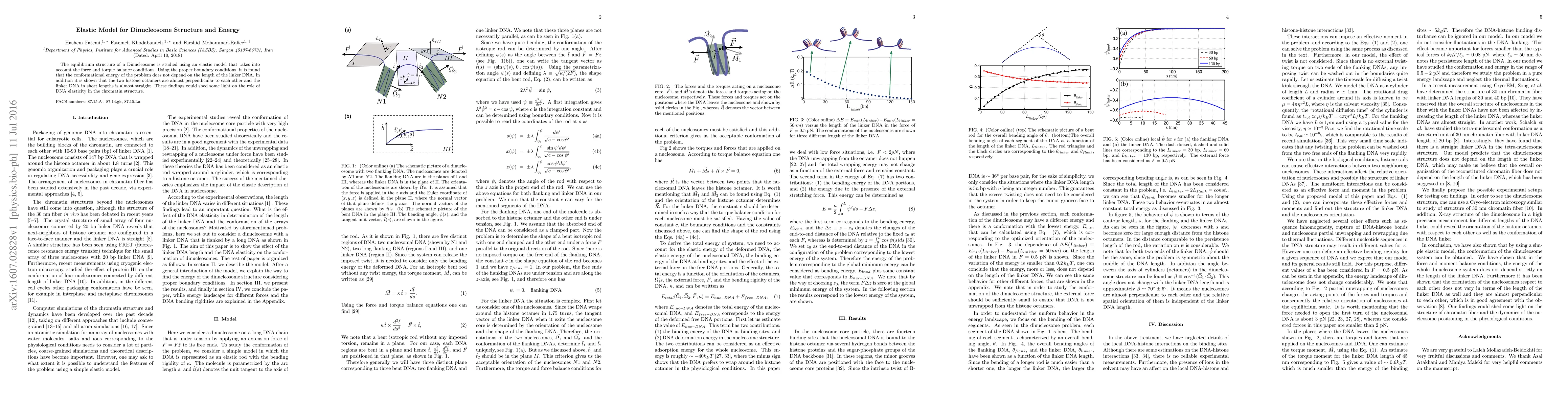 The equilibrium structure of a Dinucleosome is studied using an elastic model that takes into account the force and torque balance conditions. Using the proper boundary conditions, it is found that the conformational energy of the problem does not depend on the length of the linker DNA. In addition it is shown that the two histone octamers are almost perpendicular to each other and the linker DNA in short lengths is almost straight. These findings could shed some light on the role of DNA elasticity in the chromatin structure.