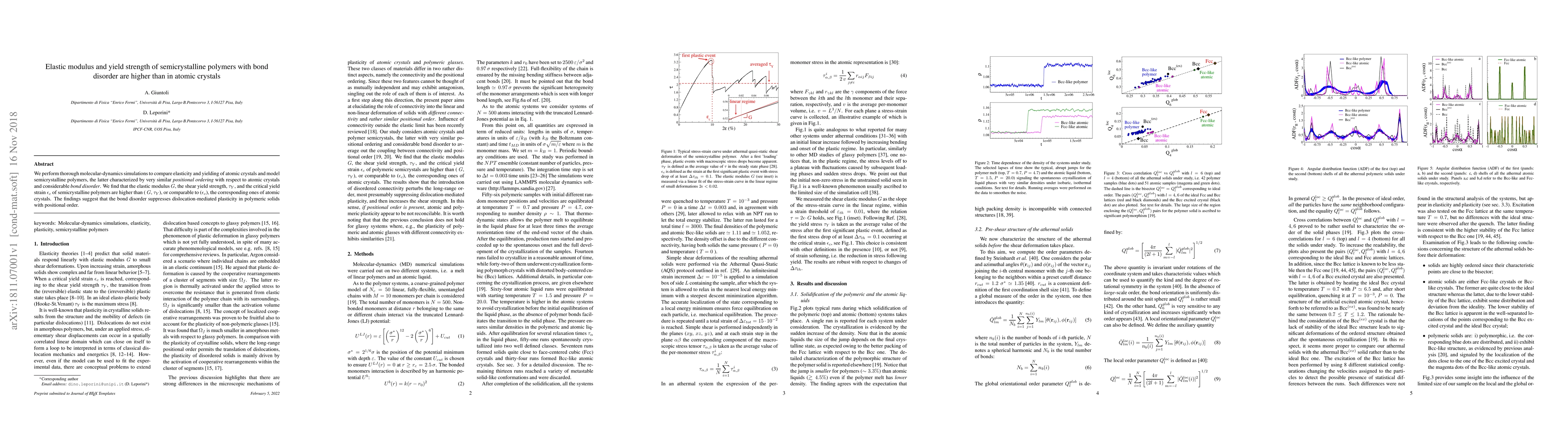 This study uses molecular-dynamics simulations to compare the elasticity and yielding of atomic crystals and semicrystalline polymers, finding that the latter exhibit higher elastic modulus and yield strength, suggesting bond disorder suppresses dislocation-mediated plasticity in these polymers.
