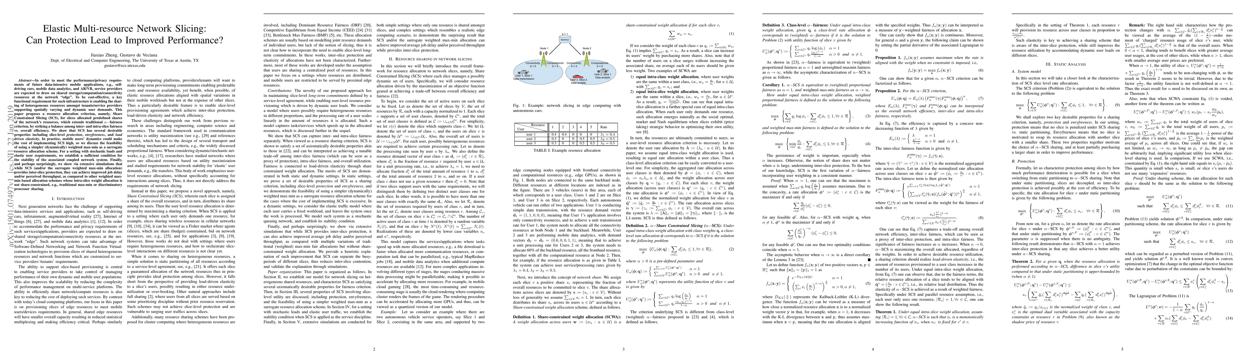 In order to meet the performance/privacy requirements of future data-intensive mobile applications, e.g., self-driving cars, mobile data analytics, and AR/VR, service providers are expected to draw on shared storage/computation/connectivity resources at the network "edge". To be cost-effective, a key functional requirement for such infrastructure is enabling the sharing of heterogeneous resources amongst tenants/service providers supporting spatially varying and dynamic user demands. This paper proposes a resource allocation criterion, namely, Share Constrained Slicing (SCS), for slices allocated predefined shares of the network's resources, which extends the traditional alpha-fairness criterion, by striking a balance among inter- and intra-slice fairness vs. overall efficiency. We show that SCS has several desirable properties including slice-level protection, envyfreeness, and load driven elasticity. In practice, mobile users' dynamics could make the cost of implementing SCS high, so we discuss the feasibility of using a simpler (dynamically) weighted max-min as a surrogate resource allocation scheme. For a setting with stochastic loads and elastic user requirements, we establish a sufficient condition for the stability of the associated coupled network system. Finally, and perhaps surprisingly, we show via extensive simulations that while SCS (and/or the surrogate weighted max-min allocation) provides inter-slice protection, they can achieve improved job delay and/or perceived throughput, as compared to other weighted max-min based allocation schemes whose intra-slice weight allocation is not share-constrained, e.g., traditional max-min or discriminatory processor sharing.