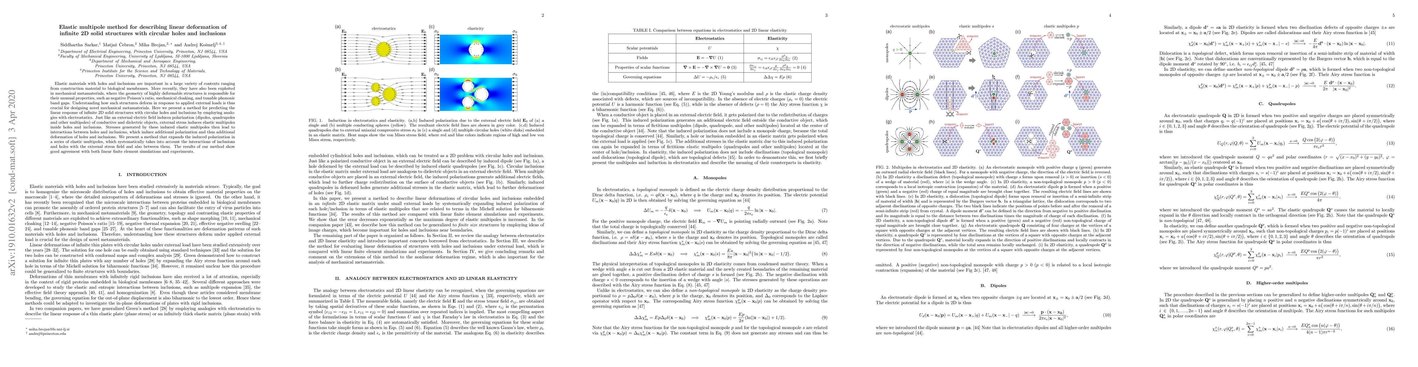 Elastic materials with holes and inclusions are important in a large variety of contexts ranging from construction material to biological membranes. More recently, they have also been exploited in mechanical metamaterials, where the geometry of highly deformable structures is responsible for their unusual properties, such as negative Poisson's ratio, mechanical cloaking, and tunable phononic band gaps. Understanding how such structures deform in response to applied external loads is thus crucial for designing novel mechanical metamaterials. Here we present a method for predicting the linear response of infinite 2D solid structures with circular holes and inclusions by employing analogies with electrostatics. Just like an external electric field induces polarization (dipoles, quadrupoles and other multipoles) of conductive and dielectric objects, external stress induces elastic multipoles inside holes and inclusions. Stresses generated by these induced elastic multipoles then lead to interactions between holes and inclusions, which induce additional polarization and thus additional deformation of holes and inclusions. We present a method that expands the induced polarization in a series of elastic multipoles, which systematically takes into account the interactions of inclusions and holes with the external stress field and also between them. The results of our method show good agreement with both linear finite element simulations and experiments.