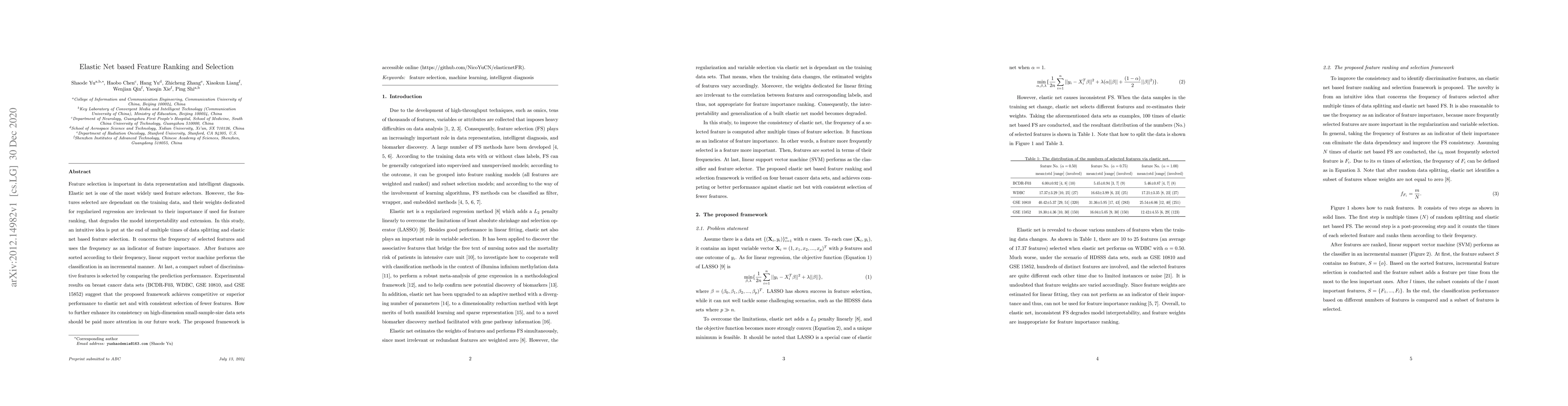 Feature selection is important in data representation and intelligent diagnosis. Elastic net is one of the most widely used feature selectors. However, the features selected are dependant on the training data, and their weights dedicated for regularized regression are irrelevant to their importance if used for feature ranking, that degrades the model interpretability and extension. In this study, an intuitive idea is put at the end of multiple times of data splitting and elastic net based feature selection. It concerns the frequency of selected features and uses the frequency as an indicator of feature importance. After features are sorted according to their frequency, linear support vector machine performs the classification in an incremental manner. At last, a compact subset of discriminative features is selected by comparing the prediction performance. Experimental results on breast cancer data sets (BCDR-F03, WDBC, GSE 10810, and GSE 15852) suggest that the proposed framework achieves competitive or superior performance to elastic net and with consistent selection of fewer features. How to further enhance its consistency on high-dimension small-sample-size data sets should be paid more attention in our future work. The proposed framework is accessible online (https://github.com/NicoYuCN/elasticnetFR).