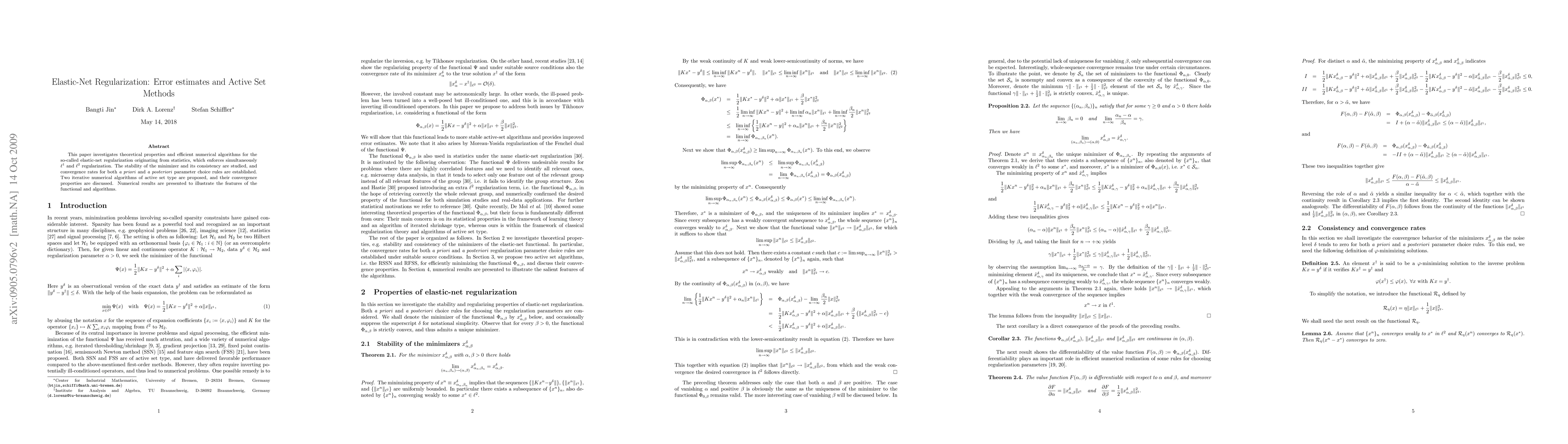 This paper investigates theoretical properties and efficient numerical algorithms for the so-called elastic-net regularization originating from statistics, which enforces simultaneously l^1 and l^2 regularization. The stability of the minimizer and its consistency are studied, and convergence rates for both a priori and a posteriori parameter choice rules are established. Two iterative numerical algorithms of active set type are proposed, and their convergence properties are discussed. Numerical results are presented to illustrate the features of the functional and algorithms.