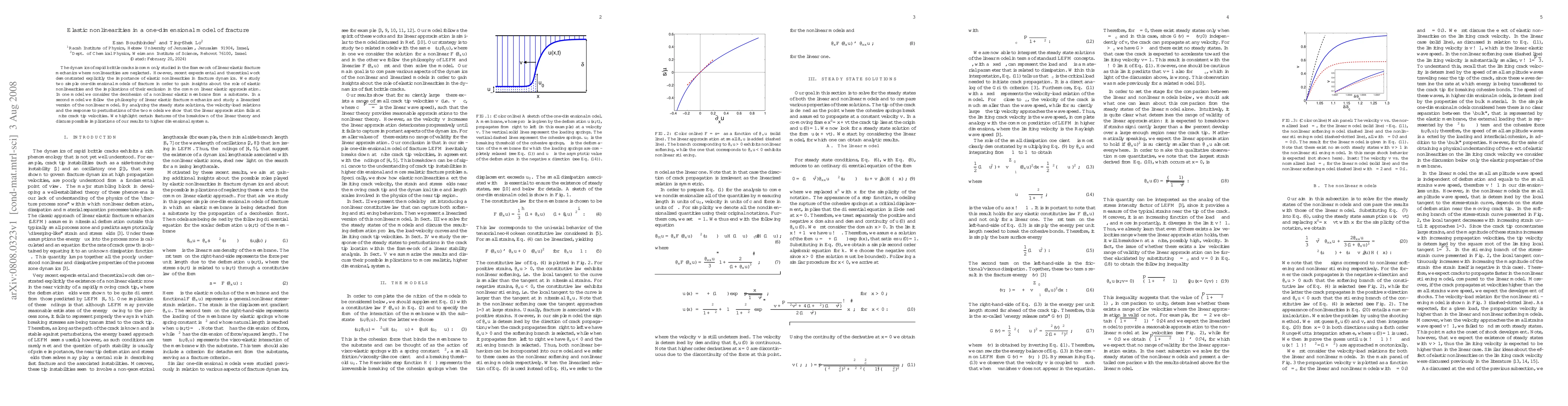 This paper investigates the role of elastic nonlinearities in fracture dynamics using two one-dimensional models: one considering decohesion of a nonlinear elastic membrane and the other a linearized version. The study reveals that linear elastic fracture mechanics fails at finite crack tip velocities, highlighting the importance of nonlinear effects in fracture dynamics.