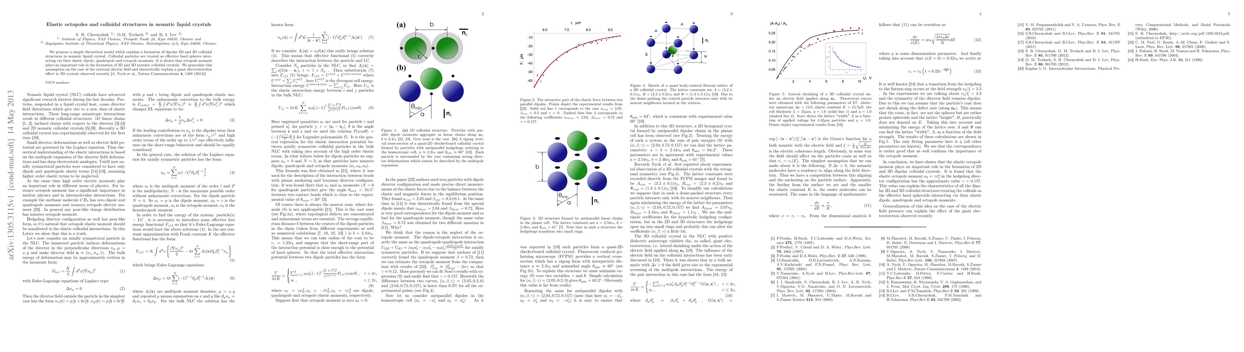 This paper proposes a theoretical model to explain the formation of 2D and 3D colloidal structures in nematic liquid crystals, emphasizing the role of octopole moments in crystal formation and the giant electrostriction effect under an external electric field.