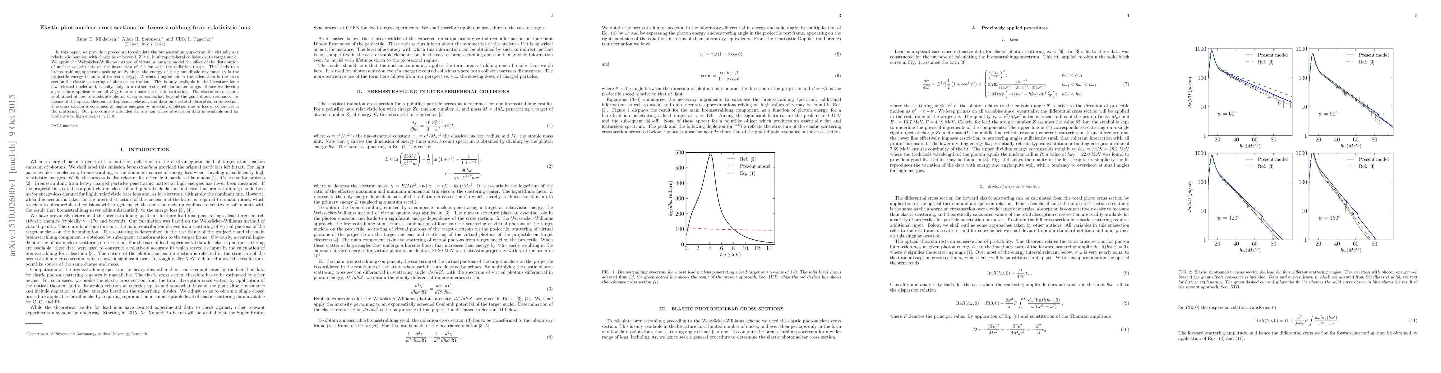 In this paper, we provide a procedure to calculate the bremsstrahlung spectrum for virtually any relativistic bare ion with charge 6$e$ or beyond, $Z\ge 6$, in ultraperipheral collisions with target nuclei. We apply the Weizs\"{a}cker-Williams method of virtual quanta to model the effect of the distribution of nuclear constituents on the interaction of the ion with the radiation target. This leads to a bremsstrahlung spectrum peaking at $2\gamma$ times the energy of the giant dipole resonance ($\gamma$ is the projectile energy in units of its rest energy). A central ingredient in the calculation is the cross section for elastic scattering of photons on the ion. This is only available in the literature for a few selected nuclei and, usually, only in a rather restricted parameter range. Hence we develop a procedure applicable for all $Z\geq6$ to estimate the elastic scattering. The elastic cross section is obtained at low to moderate photon energies, somewhat beyond the giant dipole resonance, by means of the optical theorem, a dispersion relation, and data on the total absorption cross section. The cross section is continued at higher energies by invoking depletion due to loss of coherence in the scattering. Our procedure is intended for any ion where absorption data is available and for moderate to high energies, $\gamma \gtrsim 10$.