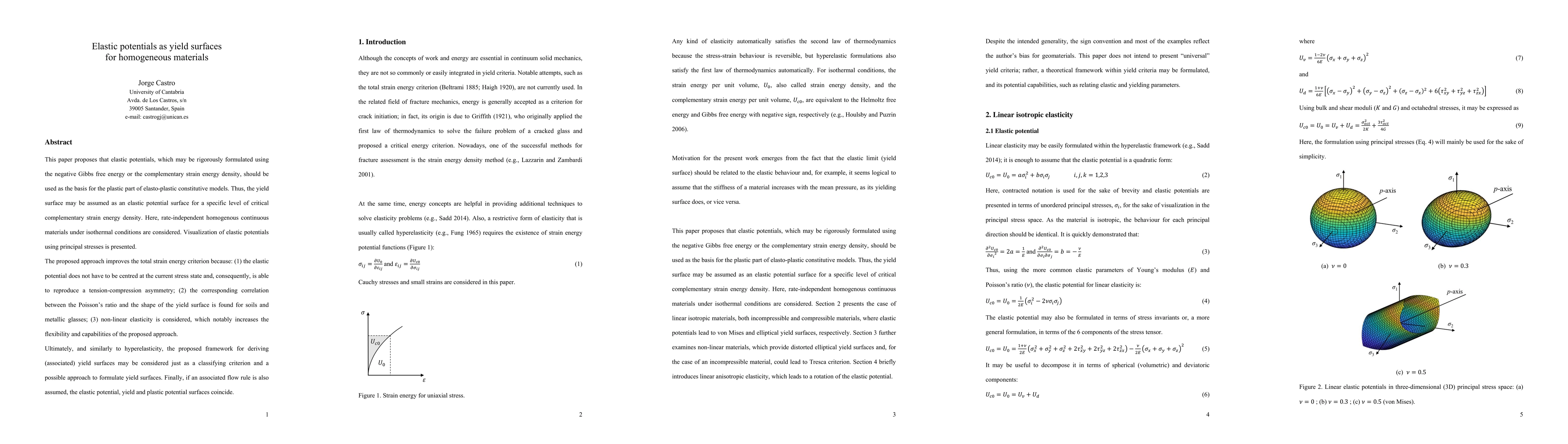 This paper suggests using elastic potentials as yield surfaces for elasto-plastic constitutive models, improving the total strain energy criterion by incorporating tension-compression asymmetry and non-linear elasticity. The approach aligns Poisson's ratio with yield surface shape and allows for associated flow rules where elastic, yield, and plastic potential surfaces coincide.