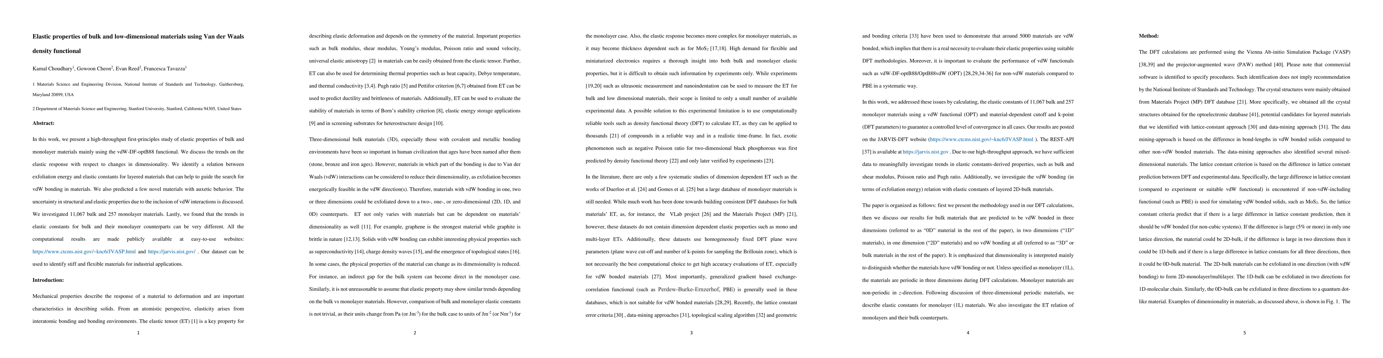 In this work, we present a high-throughput first-principles study of elastic properties of bulk and monolayer materials mainly using the vdW-DF-optB88 functional. We discuss the trends on the elastic response with respect to changes in dimensionality. We identify a relation between exfoliation energy and elastic constants for layered materials that can help to guide the search for vdW bonding in materials. We also predicted a few novel materials with auxetic behavior. The uncertainty in structural and elastic properties due to the inclusion of vdW interactions is discussed. We investigated 11,067 bulk and 257 monolayer materials. Lastly, we found that the trends in elastic constants for bulk and their monolayer counterparts can be very different. All the computational results are made publicly available at easy-to-use websites: https://www.ctcms.nist.gov/~knc6/JVASP.html and https://jarvis.nist.gov/ . Our dataset can be used to identify stiff and flexible materials for industrial applications.