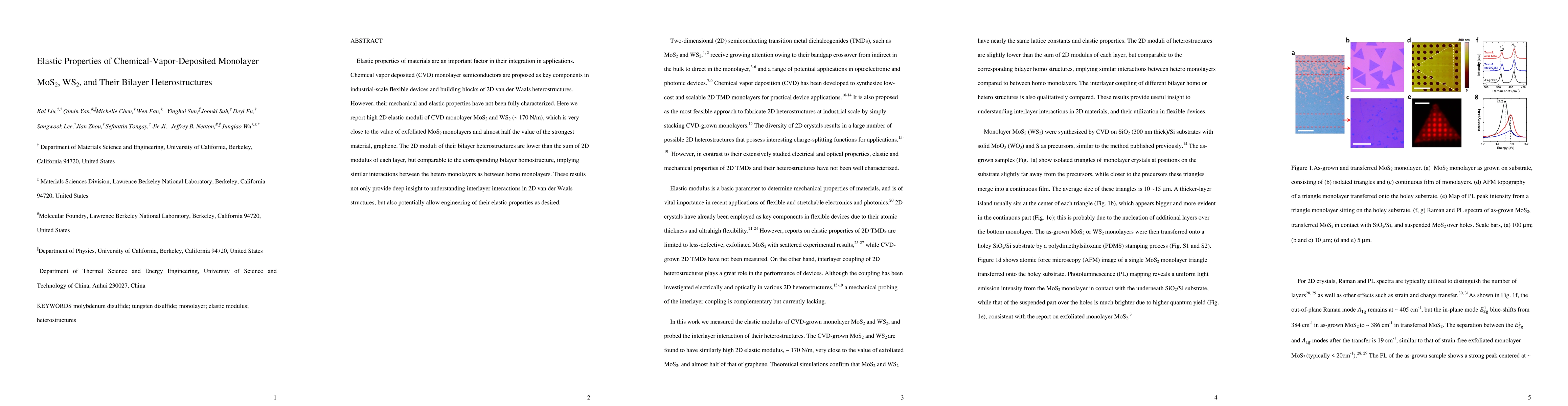 Elastic properties of materials are an important factor in their integration in applications. Chemical vapor deposited (CVD) monolayer semiconductors are proposed as key components in industrial-scale flexible devices and building blocks of 2D van der Waals heterostructures. However, their mechanical and elastic properties have not been fully characterized. Here we report high 2D elastic moduli of CVD monolayer MoS2 and WS2 (~ 170 N/m), which is very close to the value of exfoliated MoS2 monolayers and almost half the value of the strongest material, graphene. The 2D moduli of their bilayer heterostructures are lower than the sum of 2D modulus of each layer, but comparable to the corresponding bilayer homostructure, implying similar interactions between the hetero monolayers as between homo monolayers. These results not only provide deep insight to understanding interlayer interactions in 2D van der Waals structures, but also potentially allow engineering of their elastic properties as desired.