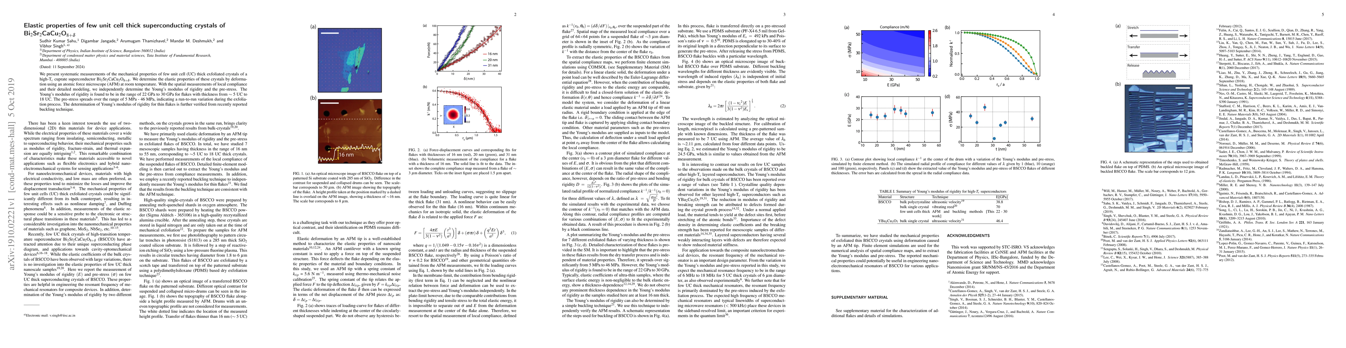 We present systematic measurements of the mechanical properties of few unit cell (UC) thick exfoliated crystals of a high-T$_c$ cuprate superconductor Bi$_2$Sr$_2$CaCu$_2$O$_{8+\delta}$. We determine the elastic properties of these crystals by deformation using an atomic force microscope (AFM) at room temperature. With the spatial measurements of local compliance and their detailed modeling, we independently determine the Young's modulus of rigidity and the pre-stress. The Young's modulus of rigidity is found to be in the range of 22 GPa to 30 GPa for flakes with thickness from 5 UC to 18 UC. The pre-stress spreads over the range of 5 MPa - 46 MPa, indicating a run-to-run variation during the exfoliation process. The determination of Young's modulus of rigidity for thin flakes is further verified from recently reported buckling technique.