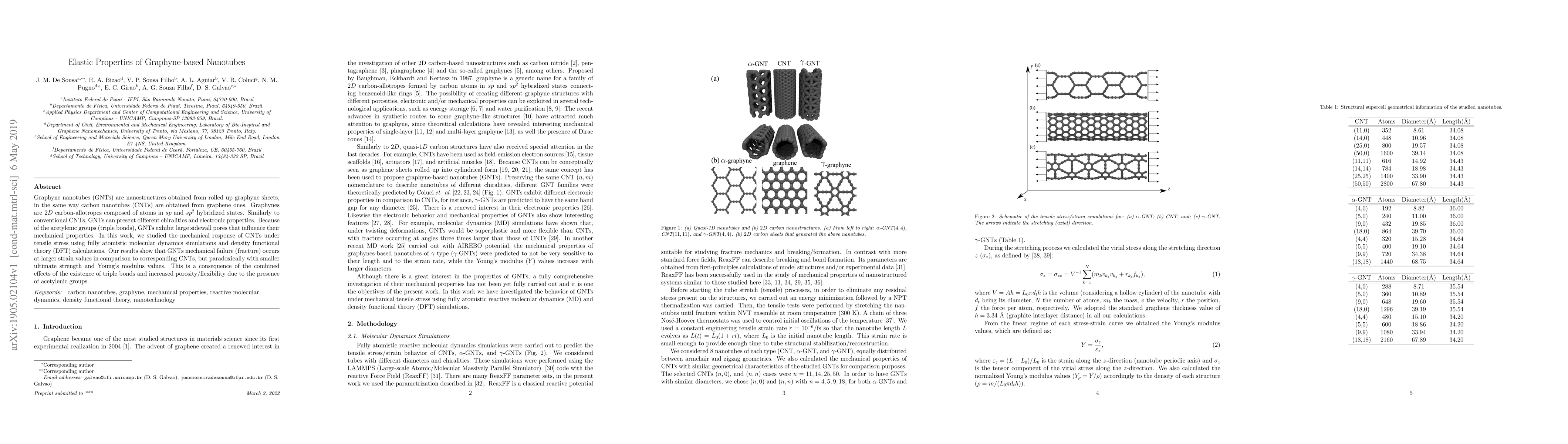This study investigates the elastic properties of graphyne-based nanotubes (GNTs) using molecular dynamics simulations and DFT calculations, revealing that GNTs exhibit higher fracture strain but lower ultimate strength and Young's modulus compared to carbon nanotubes, due to the influence of triple bonds and increased sidewall porosity.