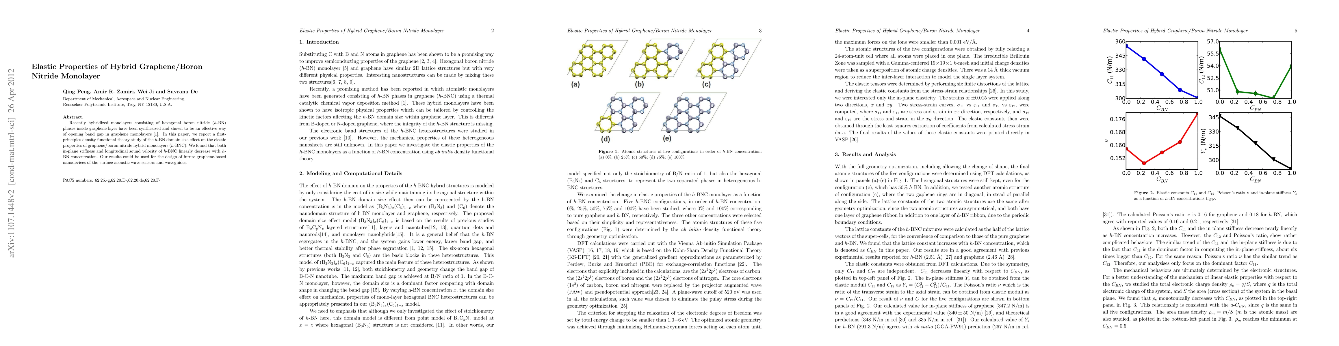 This study uses ab initio DFT to examine how varying h-BN domain sizes affect the elastic properties of graphene/boron nitride hybrid monolayers. Results show a linear decrease in in-plane stiffness and longitudinal sound velocity with increasing h-BN concentration.