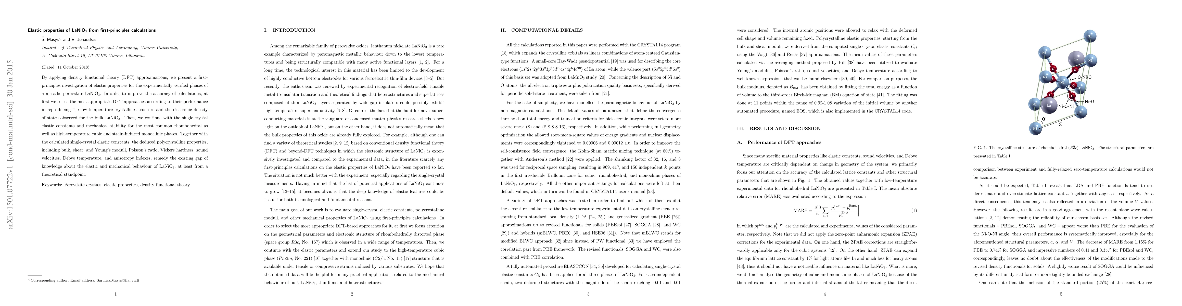 By applying density functional theory (DFT) approximations, we present a first-principles investigation of elastic properties for the experimentally verified phases of a metallic perovskite LaNiO$_{3}$. In order to improve the accuracy of calculations, at first we select the most appropriate DFT approaches according to their performance in reproducing the low-temperature crystalline structure and the electronic density of states observed for the bulk LaNiO$_{3}$. Then, we continue with the single-crystal elastic constants and mechanical stability for the most common rhombohedral as well as high-temperature cubic and strain-induced monoclinic phases. Together with the calculated single-crystal elastic constants, the deduced polycrystalline properties, including bulk, shear, and Young's moduli, Poisson's ratio, Vickers hardness, sound velocities, Debye temperature, and anisotropy indexes, remedy the existing gap of knowledge about the elastic and mechanical behaviour of LaNiO$_{3}$, at least from a theoretical standpoint.