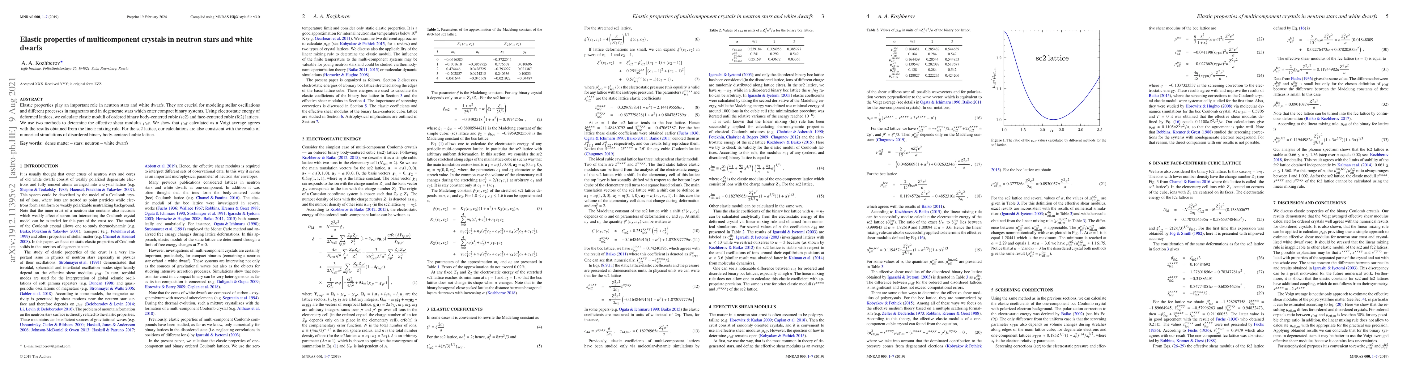 This paper investigates the elastic properties of multicomponent crystals in neutron stars and white dwarfs, focusing on ordered binary body-centered cubic and face-centered cubic lattices. The study calculates elastic moduli using electrostatic energy and finds that the effective shear modulus $\mu_{\rm eff}$ calculated via Voigt average aligns with results from the linear mixing rule and numerical simulations.