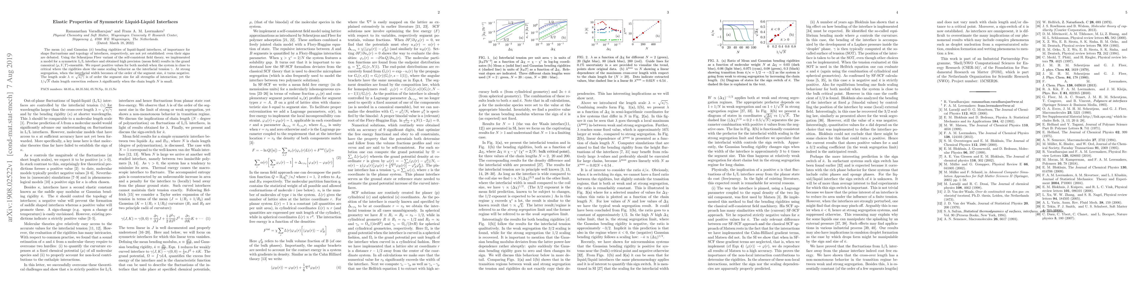 This study uses self-consistent field theory to determine the bending rigidities of symmetric liquid-liquid interfaces, finding positive values for both moduli near criticality. At strong segregation, the Gaussian bending rigidity becomes negative, while the length scale of rigidity scales with the segment size and is corrected by chain length.
