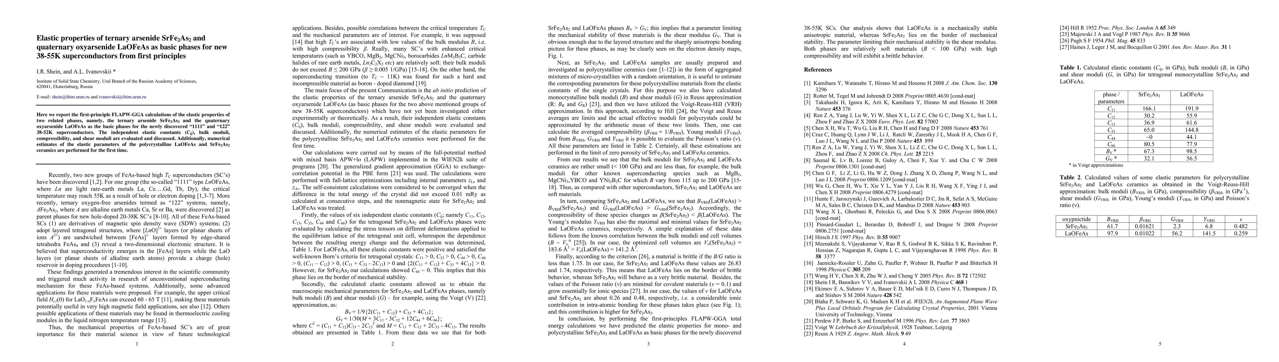 This study uses first-principle FLAPW-GGA calculations to determine the elastic properties of SrFe2As2 and LaOFeAs, foundational phases for new 38-55K superconductors. The research evaluates independent elastic constants, bulk moduli, compressibility, and shear moduli, providing initial estimates for the elastic parameters of their polycrystalline ceramics.
