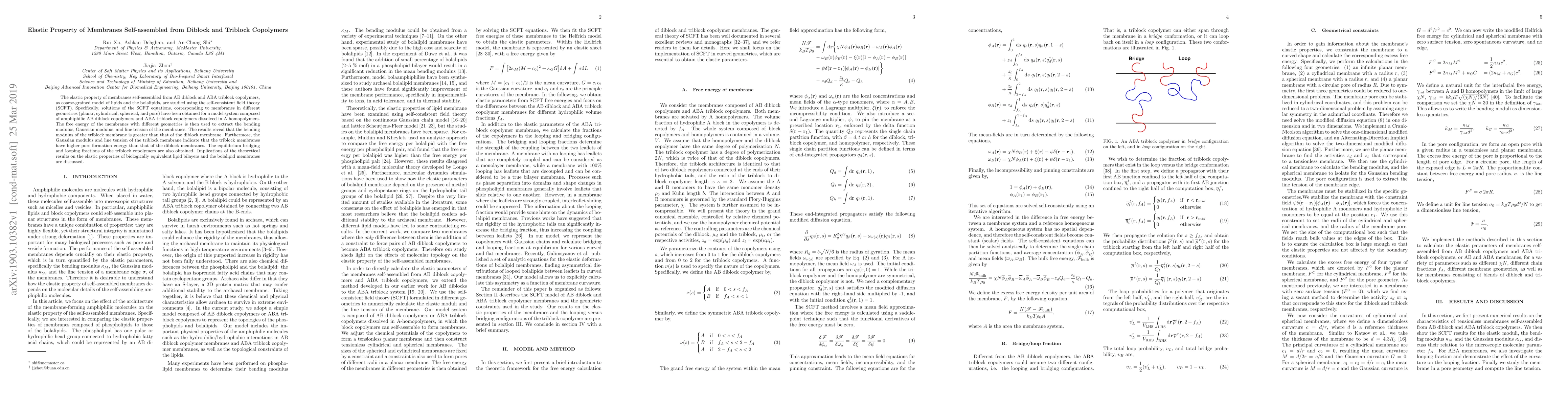 The elastic property of membranes self-assembled from AB diblock and ABA triblock copolymers, as coarse-grained model of lipids and the bolalipids, are studied using the self-consistent field theory (SCFT). Specifically, solutions of the SCFT equations, corresponding to membranes in different geometries (planar, cylindrical, spherical, and pore) have been obtained for a model system composed of amphiphilic AB diblock copolymers and ABA triblock copolymers dissolved in A homopolymers. The free energy of the membranes with different geometries is then used to extract the bending modulus, Gaussian modulus, and line tension of the membranes. The results reveal that the bending modulus of the triblock membrane is greater than that of the diblock membrane. Furthermore, the Gaussian modulus and line tension of the triblock membrane indicate that the triblock membranes have higher pore formation energy than that of the diblock membranes. The equilibrium bridging and looping fractions of the triblock copolymers are also obtained. Implications of the theoretical results on the elastic properties of biologically equivalent lipid bilayers and the bolalipid membranes are discussed.