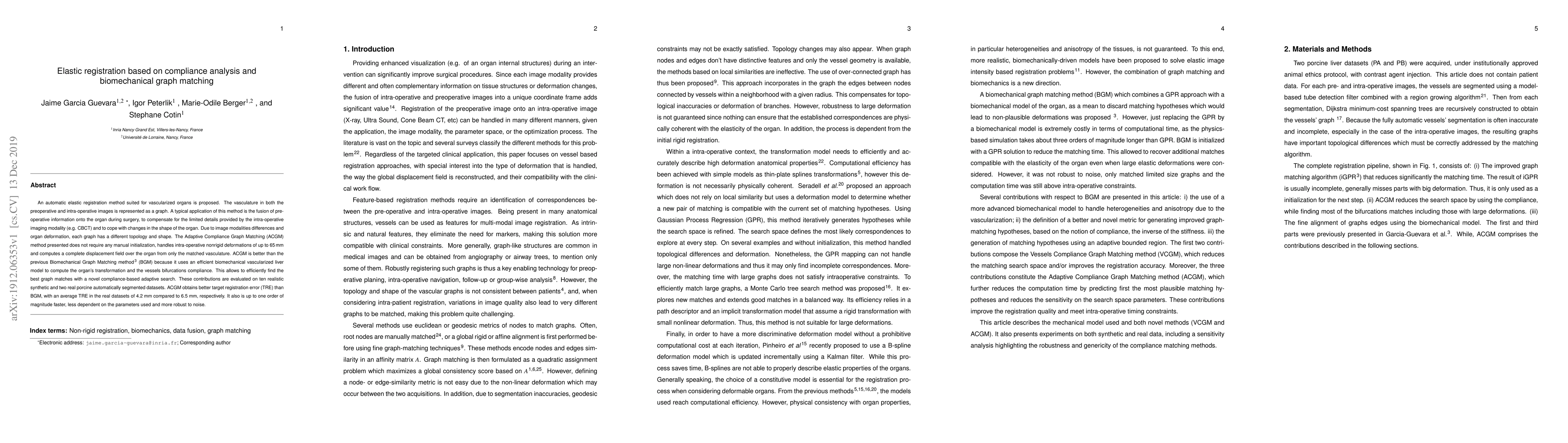 An automatic elastic registration method suited for vascularized organs is proposed. The vasculature in both the preoperative and intra-operative images is represented as a graph. A typical application of this method is the fusion of pre-operative information onto the organ during surgery, to compensate for the limited details provided by the intra-operative imaging modality (e.g. CBCT) and to cope with changes in the shape of the organ. Due to image modalities differences and organ deformation, each graph has a different topology and shape. The Adaptive Compliance Graph Matching (ACGM) method presented does not require any manual initialization, handles intra-operative nonrigid deformations of up to 65 mm and computes a complete displacement field over the organ from only the matched vasculature. ACGM is better than the previous Biomechanical Graph Matching method 3 (BGM) because it uses an efficient biomechanical vascularized liver model to compute the organ's transformation and the vessels bifurcations compliance. This allows to efficiently find the best graph matches with a novel compliance-based adaptive search. These contributions are evaluated on ten realistic synthetic and two real porcine automatically segmented datasets. ACGM obtains better target registration error (TRE) than BGM, with an average TRE in the real datasets of 4.2 mm compared to 6.5 mm, respectively. It also is up to one order of magnitude faster, less dependent on the parameters used and more robust to noise.