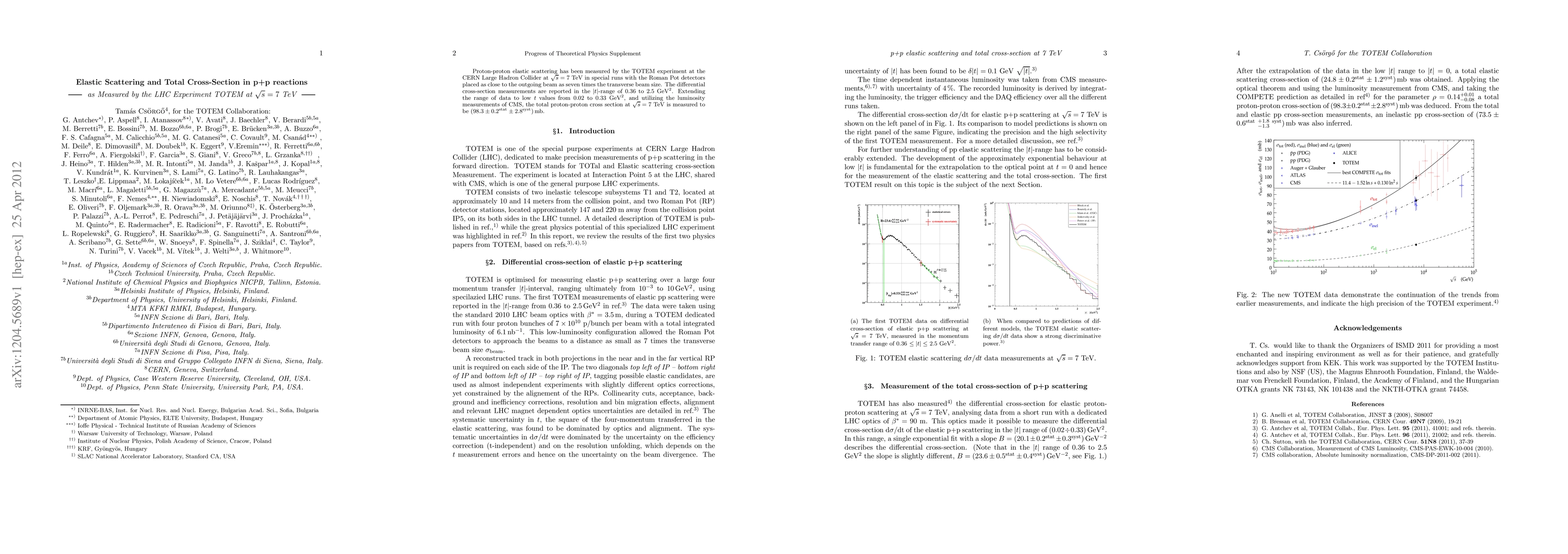 The TOTEM experiment at the LHC measured proton-proton elastic scattering at $\sqrt{s} = 7$ TeV, reporting differential cross-section data and determining the total cross-section to be (98.3 ± 0.2(stat) ± 2.8(syst)) mb. The study utilized Roman Pot detectors and extended measurements to low t values.