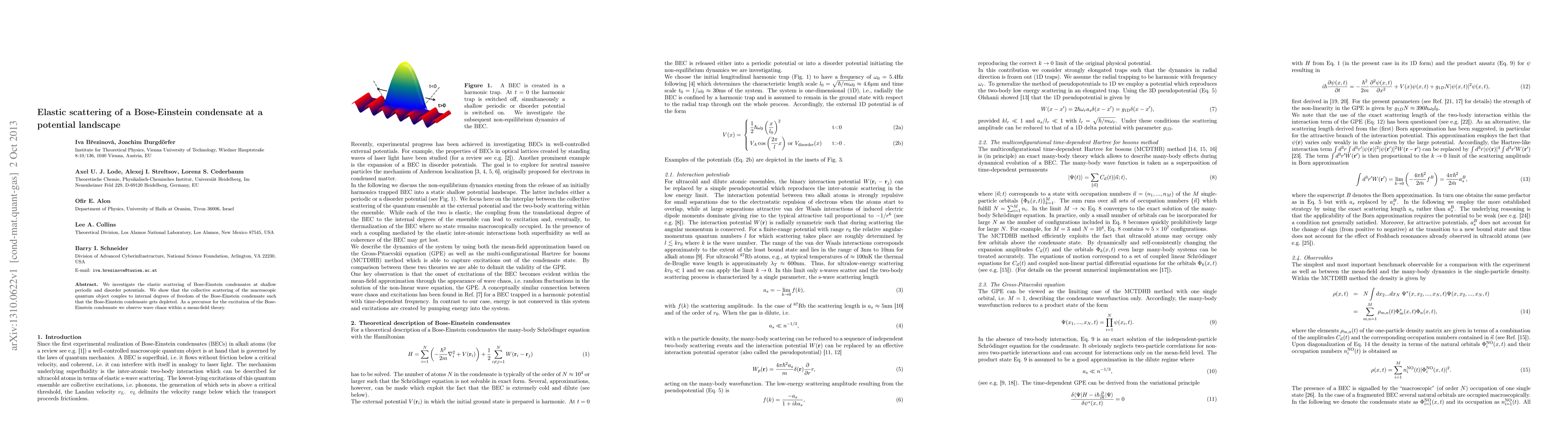 The study explores the elastic scattering of Bose-Einstein condensates through shallow periodic and disordered potentials, revealing that collective scattering depletes the condensate and leads to wave chaos, serving as a precursor for condensate excitation.