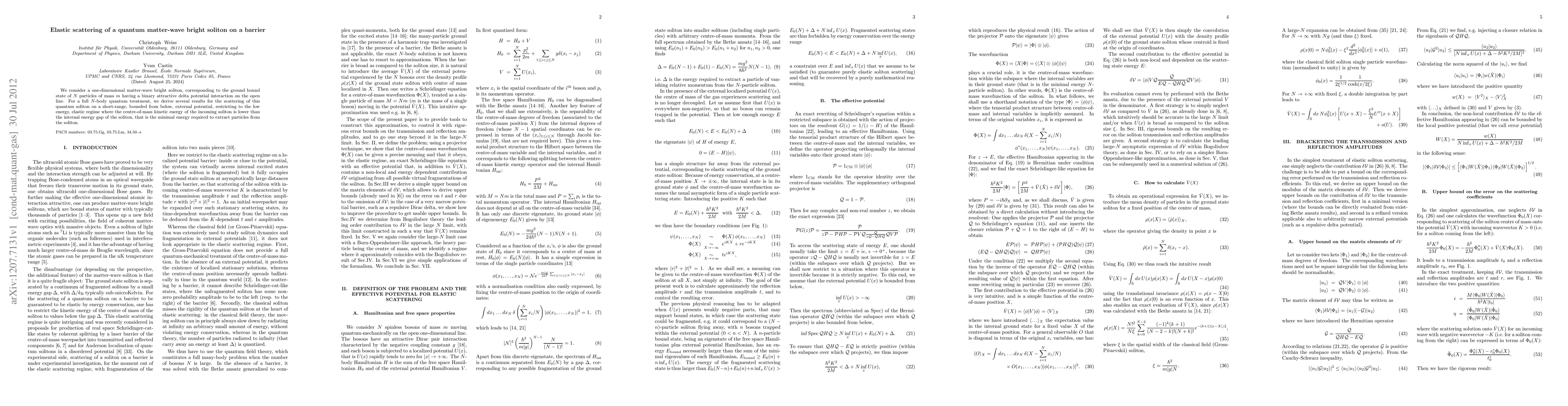 We consider a one-dimensional matter-wave bright soliton, corresponding to the ground bound state of N particles of mass m having a binary attractive delta potential interaction on the open line. For a full N-body quantum treatment, we derive several results for the scattering of this quantum soliton on a short-range, bounded from below, external potential, restricting to the low energy, elastic regime where the centre-of-mass kinetic energy of the incoming soliton is lower than the internal energy gap of the soliton, that is the minimal energy required to extract particles from the soliton.