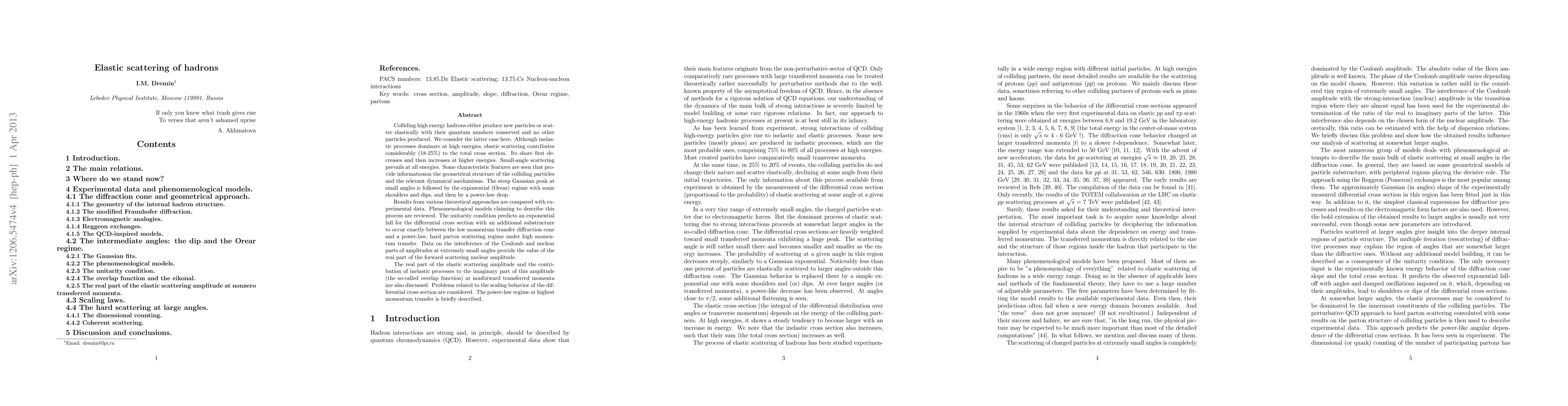 Researchers studied elastic scattering of high-energy hadrons, finding that small-angle scattering prevails at all energies, followed by an exponential regime with a power-law drop, and comparing theoretical approaches with experimental data to understand the geometry and dynamics of the process.